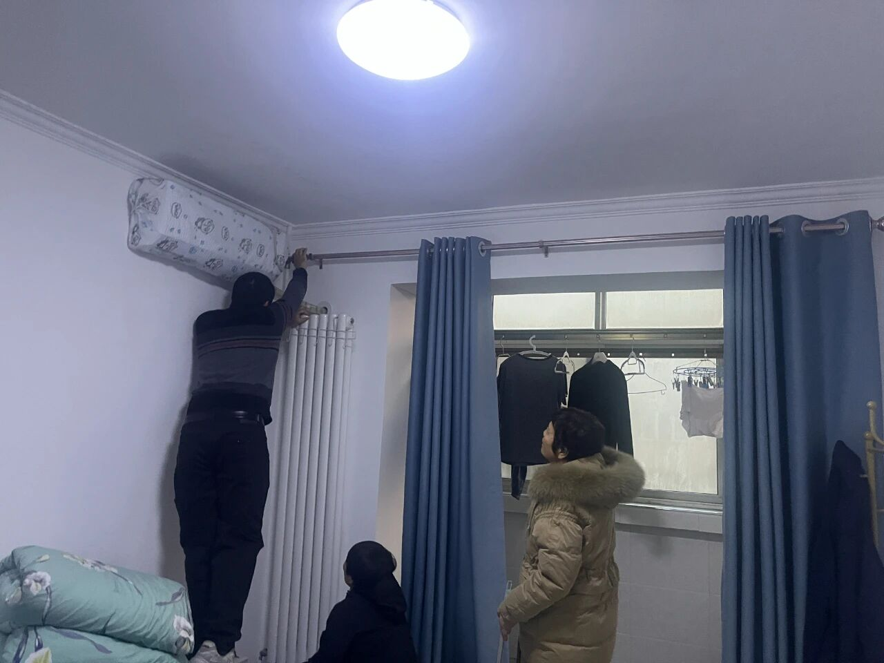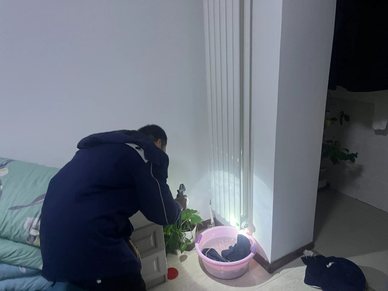 进入吴女士家后,两人发现漏水源头是暖气片上的一个砂眼,热水不断涌出,地面已形成一片积水。考虑到维修人员尚未抵达,李玉昆和刘蕊毫不犹豫地行动起来——找盆接水、用旧衣物临时堵漏、清理地面……他们一边忙碌,一边安抚居民情绪,让焦急的居民渐渐平静下来。