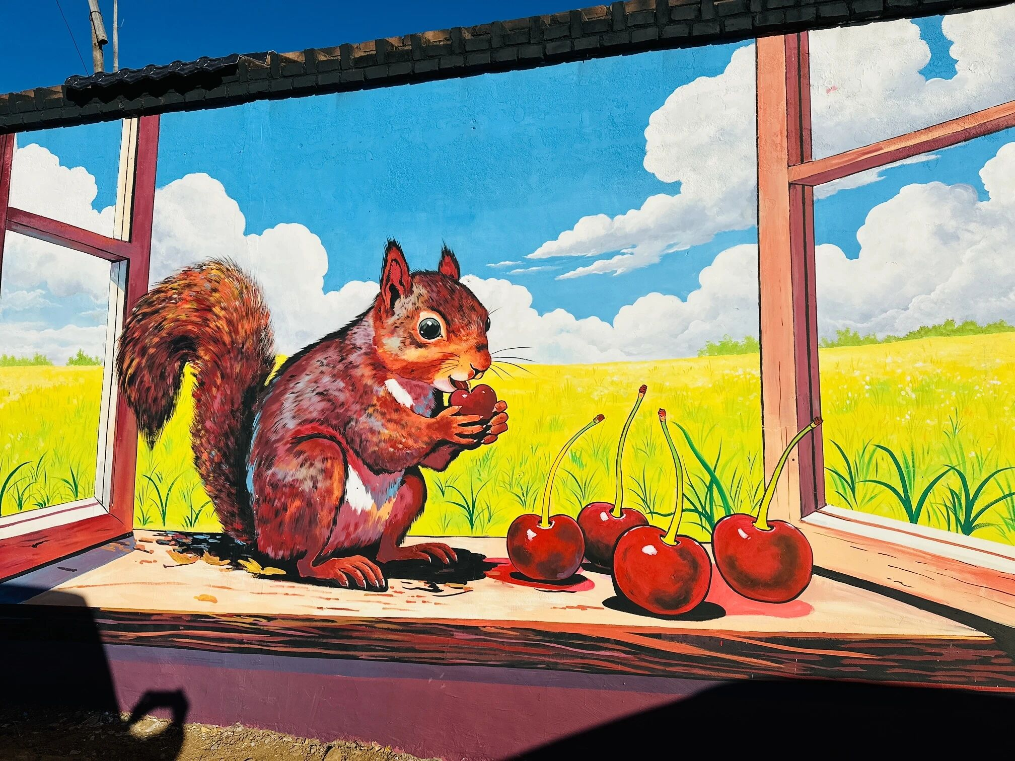 行走在昌金路上,远远就被东门绵延百米彩绘墙吸引,樱桃园的核心元素与萌宠互动场景巧妙融合,饱满多汁的樱桃挂满枝头,机灵的松鼠捧着樱桃,圆溜溜的眼睛透着满足,俏皮的小猫好奇地打量枝头的果实,灵动模样瞬间戳中少女心。
