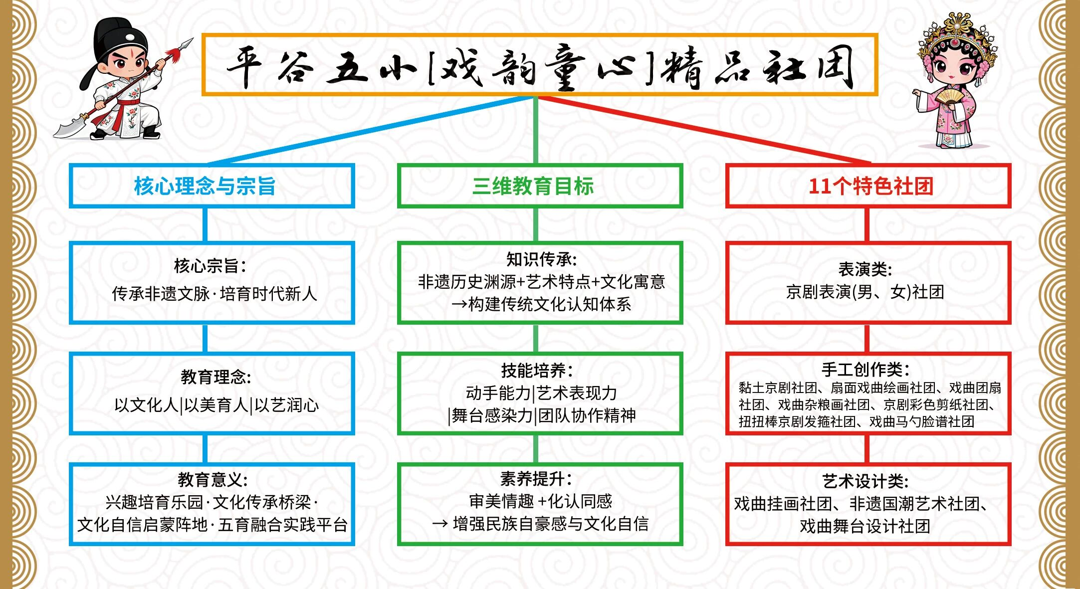 我们坚持 “传承非遗文化,培育时代新人”的核心理念,通过表演类、手工创作类、绘画设计类等11个特色社团,让京剧艺术真正走进孩子们心里。