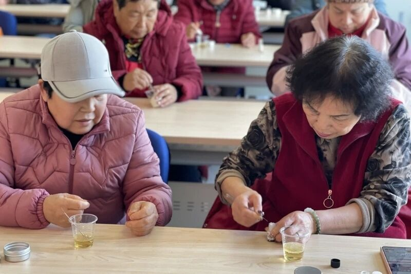 实操环节,大家兴致勃勃地动手尝试。按照配比精准称重原料,手持搅拌棒慢慢搅匀,看着原料逐渐融合成细腻的膏体,每个人的脸上都满是期待。大家一边制作,一边分享日常护手小妙招,邻里间的闲聊声、欢笑声交织在一起,活动室里暖意融融。不一会儿,一瓶瓶带着淡淡香气的自制护手霜就新鲜出炉了,居民们拿着自己的成果互相展示,成就感满满。