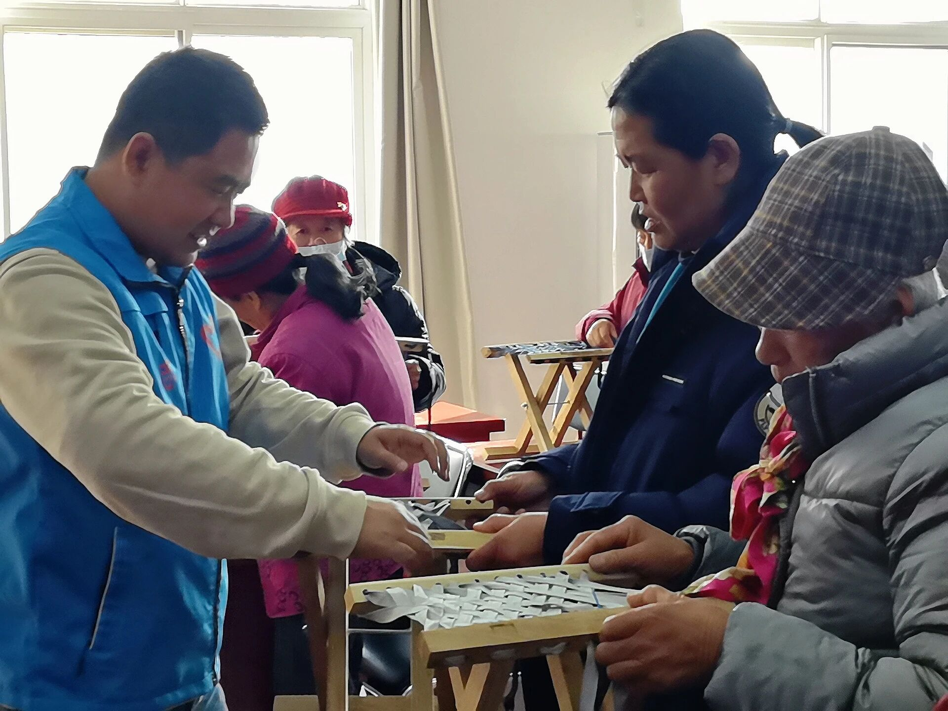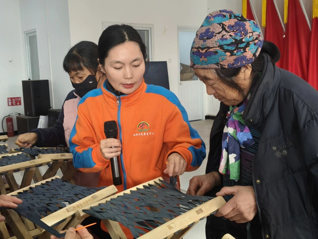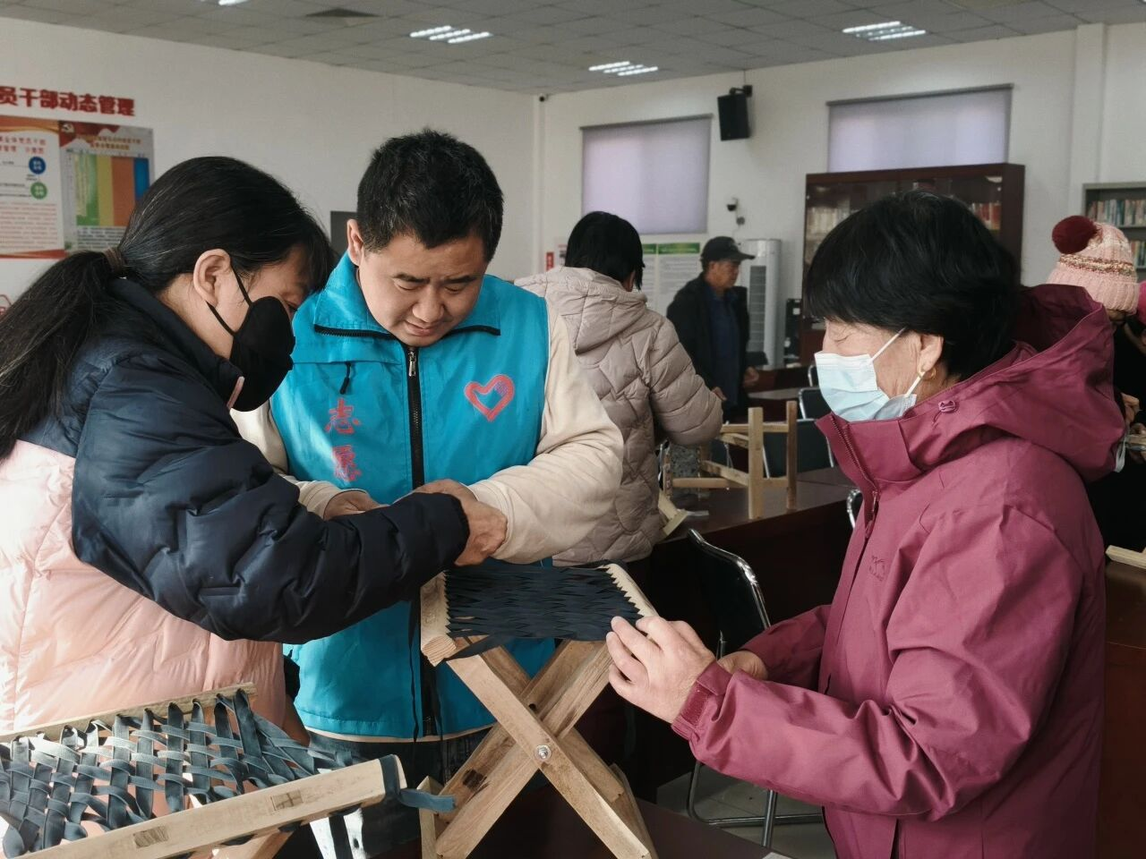 工作人员演示马扎编织的穿绳、固定技巧。村民们一边认真学习编织手法,一边交流心得,他们手持木质支架与编织绳,跟着步骤穿梭缠绕,原本零散的材料逐渐成型为结实的马扎凳,现场欢声笑语不断。