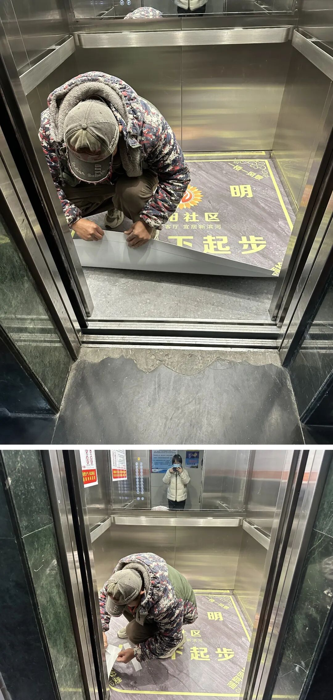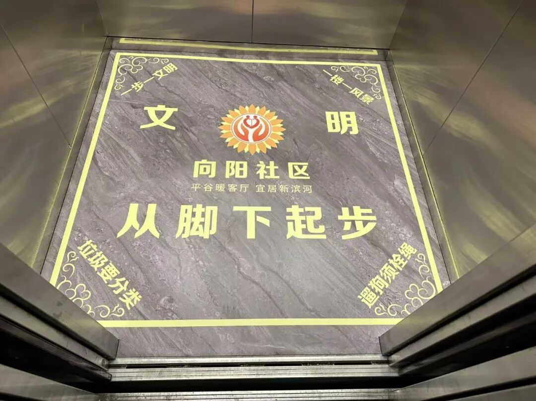在硬件升级的基础上,向阳社区更注重精神文明建设的融入。在新改造完成的电梯内,工作人员精心铺设了以“文明从脚下起步”为核心的宣传地垫,地垫上印有“垃圾要分类”“遛狗须拴绳”等文明行为提示,还融入了“平谷暖客厅 宜居新滨河” 的社区定位及向日葵造型的社区标识,让“小小的”电梯空间成为传递文明理念的移动阵地。这种将文明宣传与民生工程深度融合的方式,让居民在享受便捷出行的同时,潜移默化地接受文明熏陶。