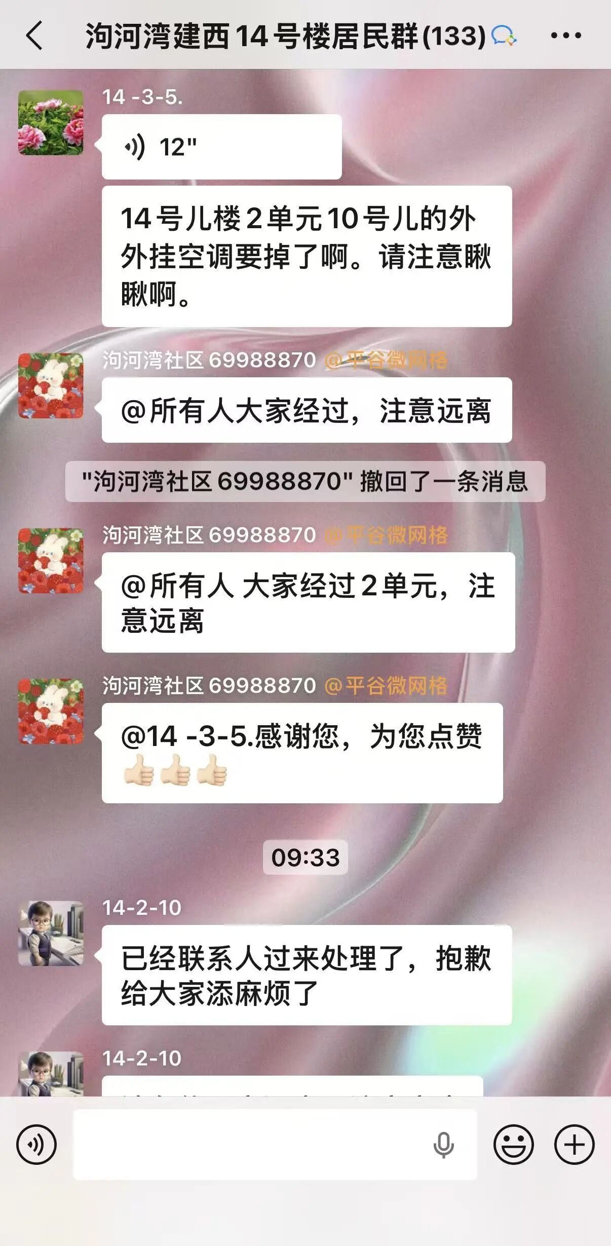 王响响、许苹苹在群内连发多条提醒,积极配合维修工作,全程跟进隐患处置过程。直至维修人员完成空调外机的加固修复工作,确认隐患彻底排除后,居民群内同步隐患消除的消息,告知居民可正常通行。