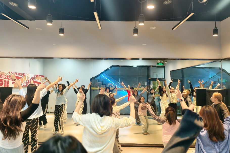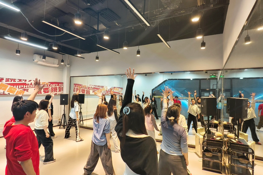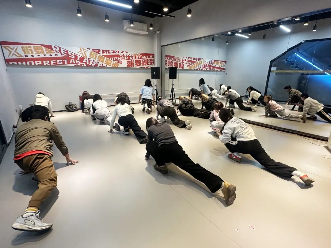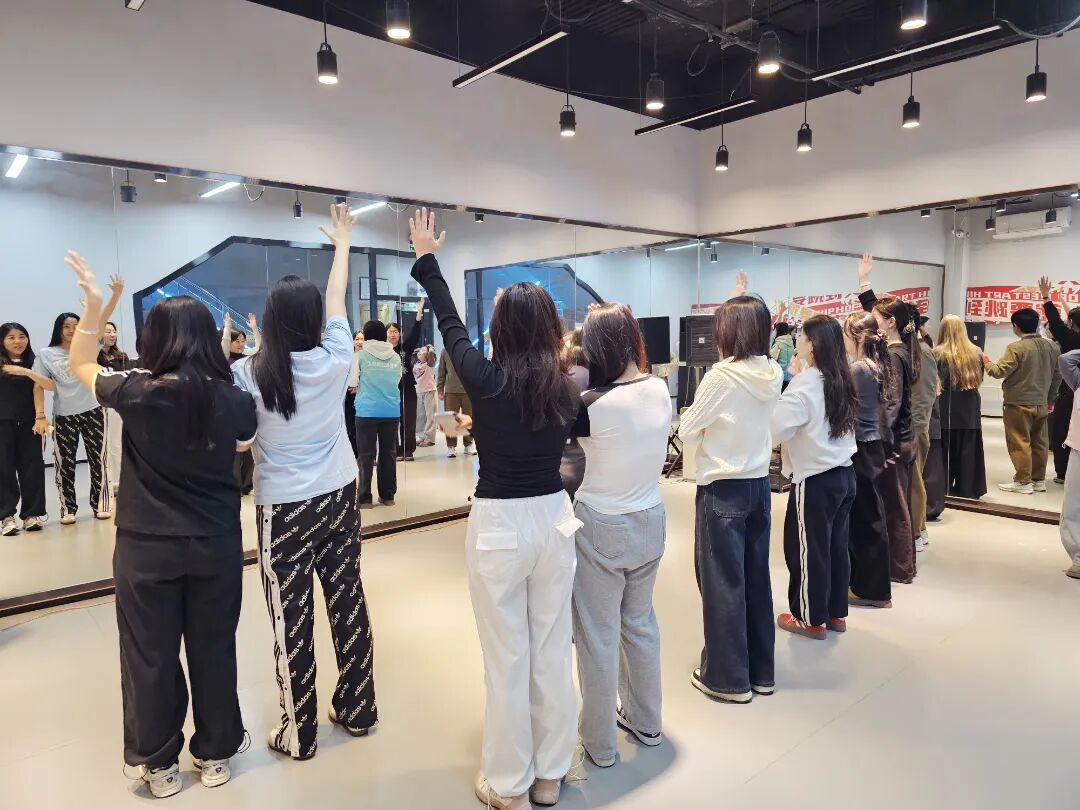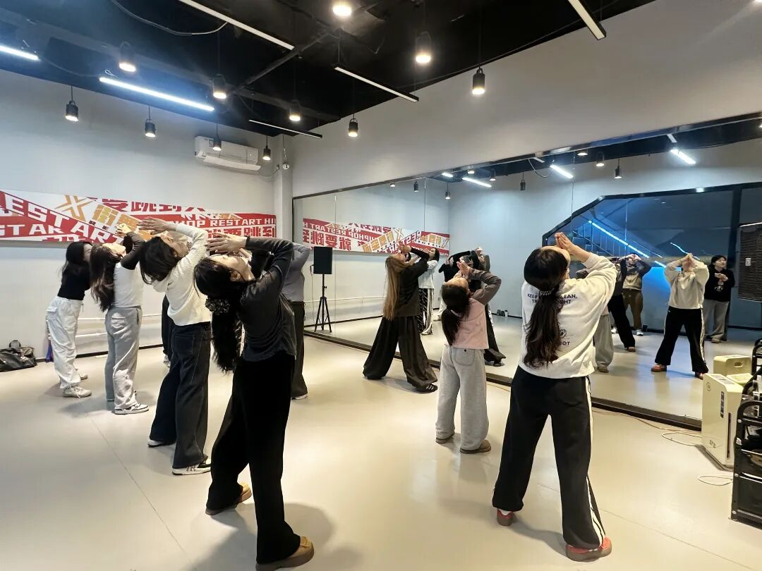 暖场环节的“街舞小问答”瞬间打破拘谨“你心中的街舞是什么样?”的提问引发热烈讨论,搭配简单的自我介绍,陌生感秒消失。随后,专业老师带领大家开展高抬腿、开合跳、弓步压腿等动态拉伸,充分激活核心力量与肢体灵活性,为技术学习铺垫。