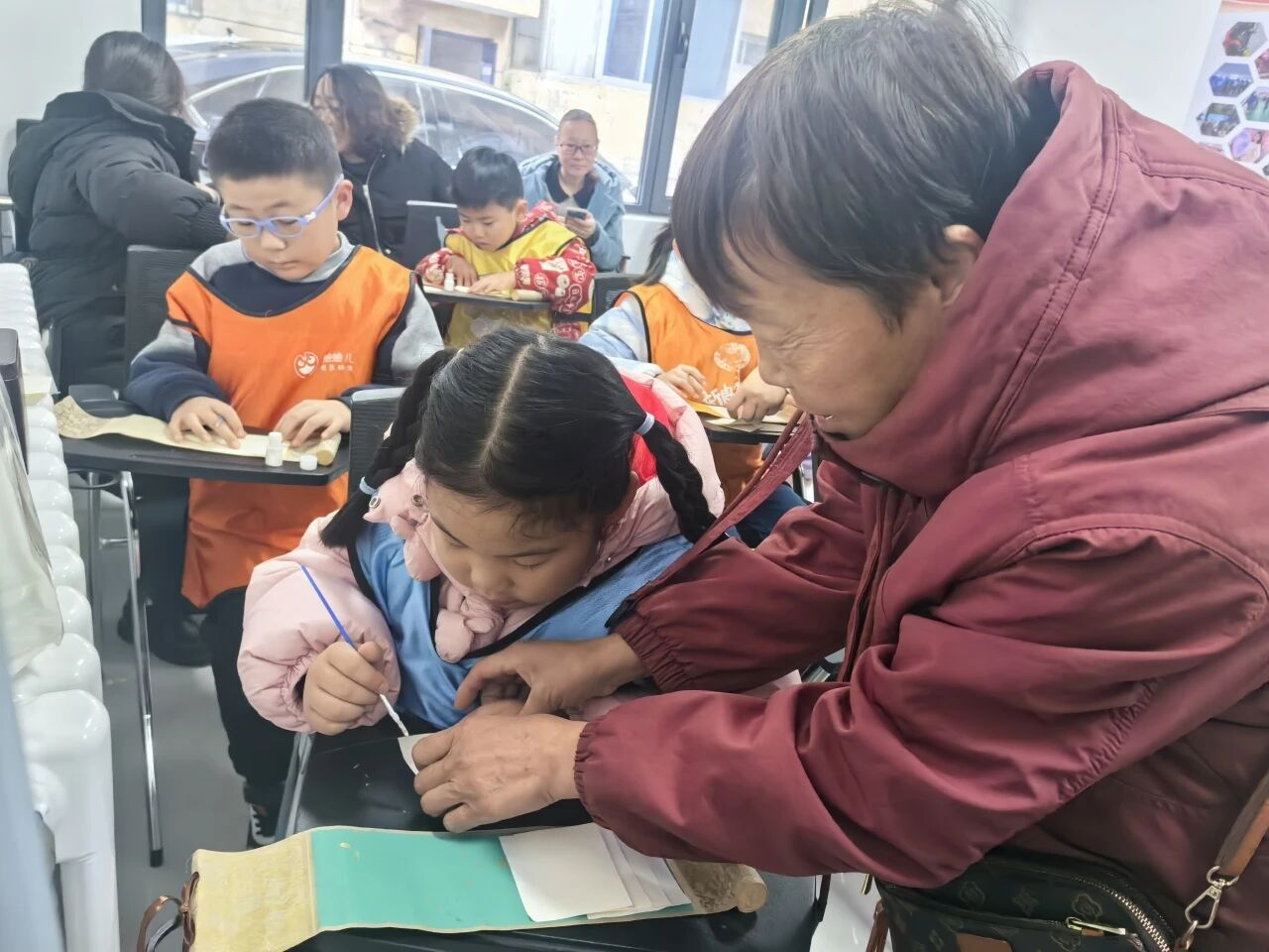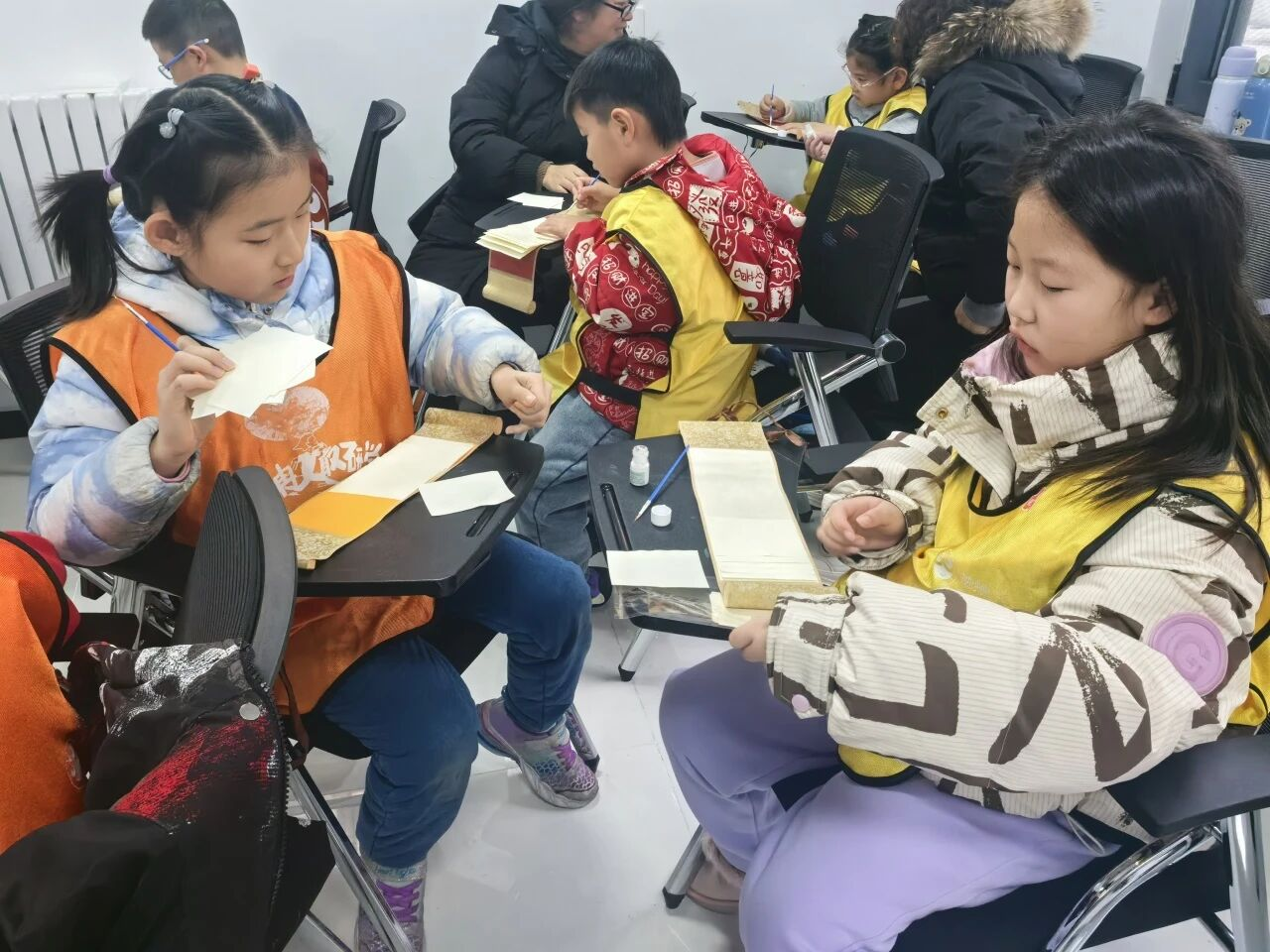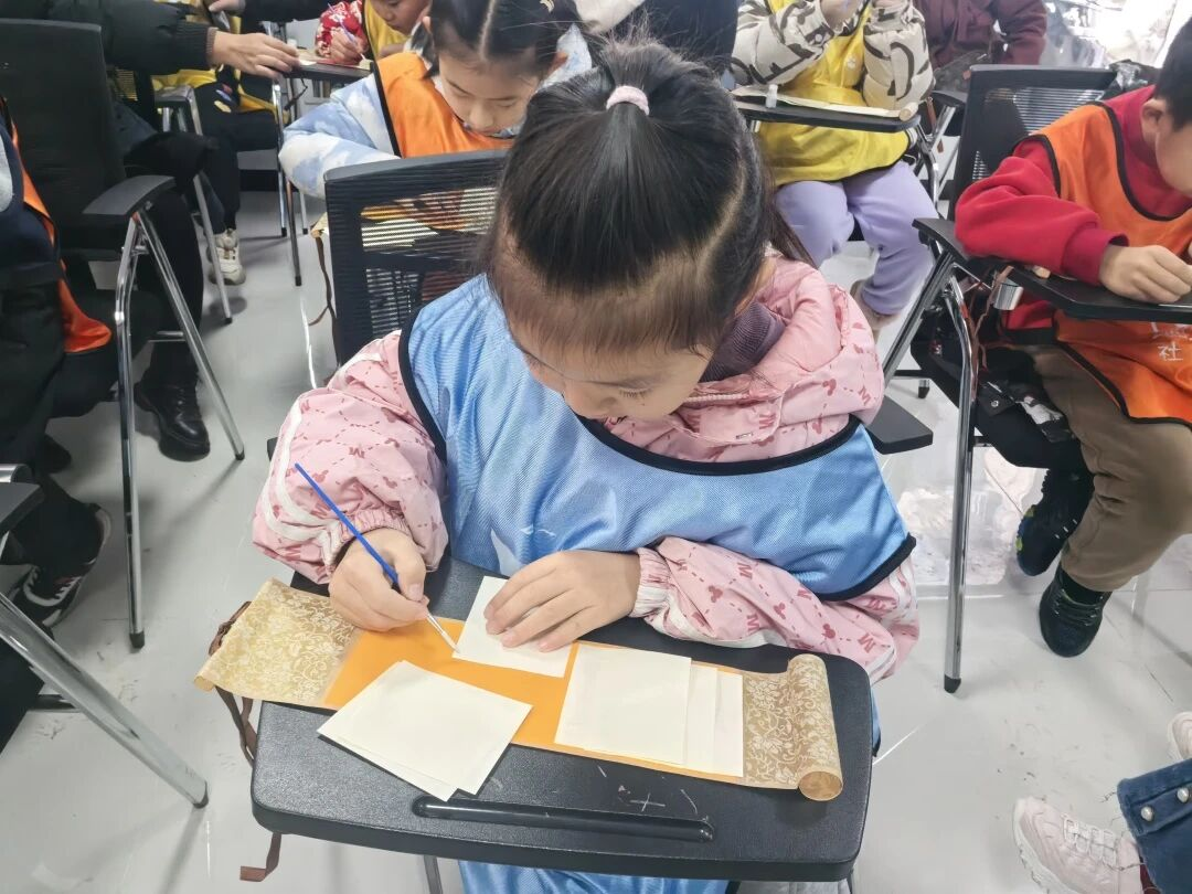 孩子们在老师的引导下,初探龙鳞装的奥秘。通过生动的讲解与实物展示,大家了解了何为“会舒展的卷轴”,并聆听了龙鳞装背后的历史故事与文化内涵。孩子们积极提问、踊跃互动,在轻松的氛围中建立起对传统装帧技艺的初步认知。活动中,孩子们化身为“小卷王”,亲手尝试折叠与拼贴龙鳞卷页,并在制成的龙鳞卷上书写或绘制属于自己的内容。大家互相欣赏、交流灵感,在卷轴间留下了独一无二的文化印记。