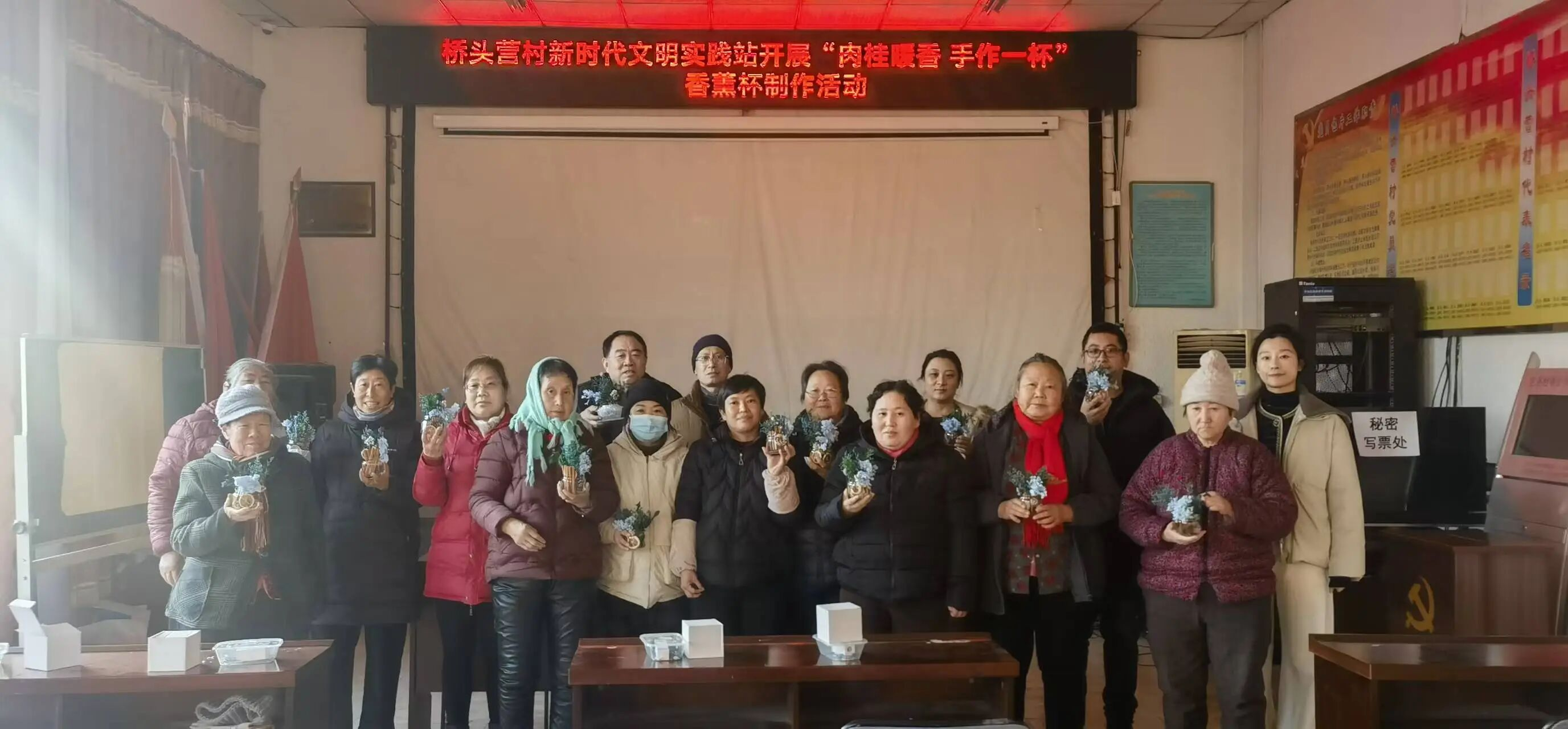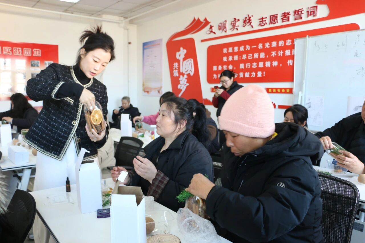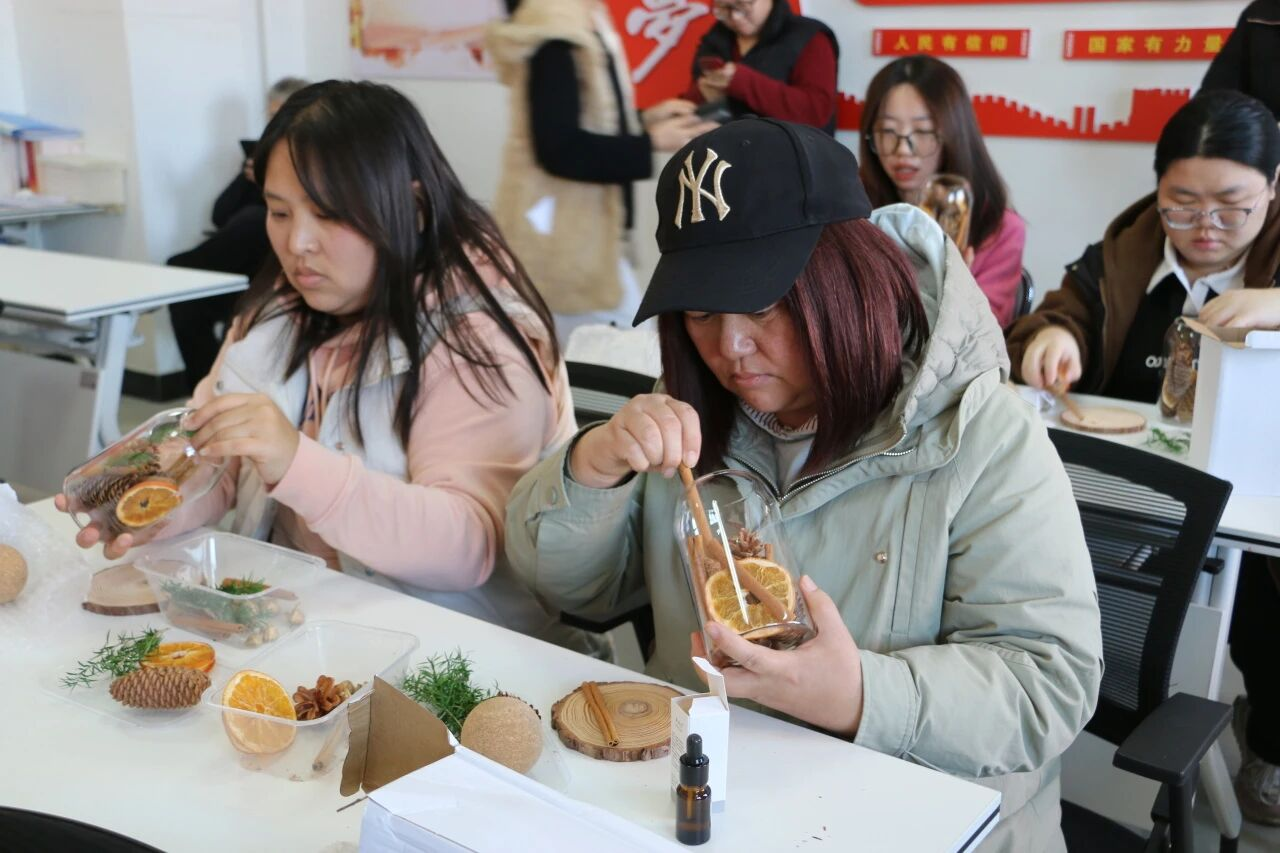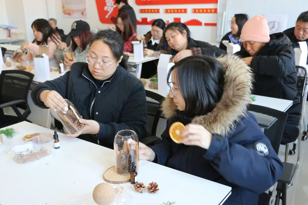 在轻松愉快的氛围中,村民们认真投入,将肉桂、松塔、柑橘片等材料细心组合,搭配干花、松枝进行装饰,并滴入喜爱的精油。不一会儿,一个个精致独特的香薰杯陆续完成,清雅香气缓缓弥漫,每一件作品都凝聚着个人的巧思与创意。活动最后,大家手捧自己的作品合影留念,脸上洋溢着喜悦与自豪的笑容。
