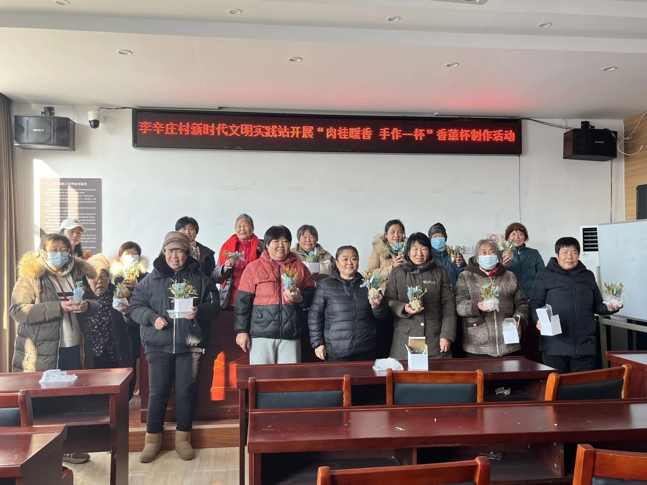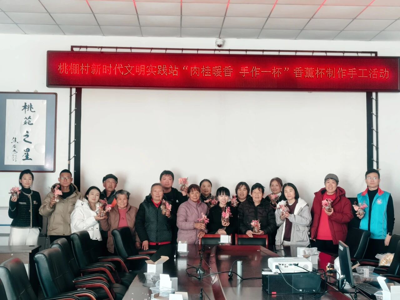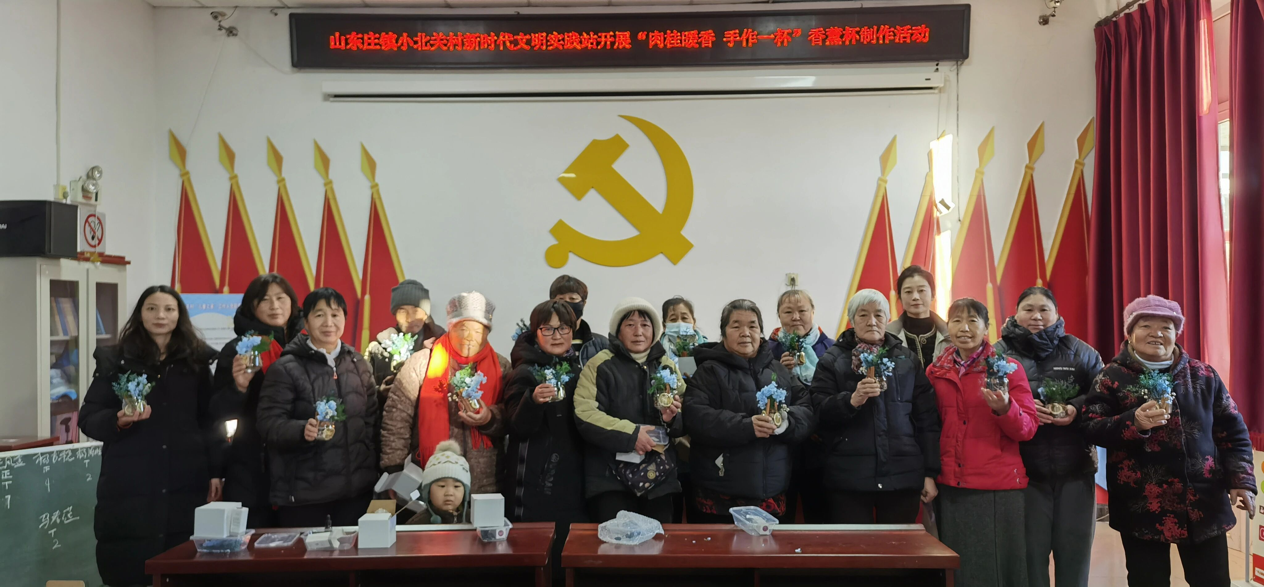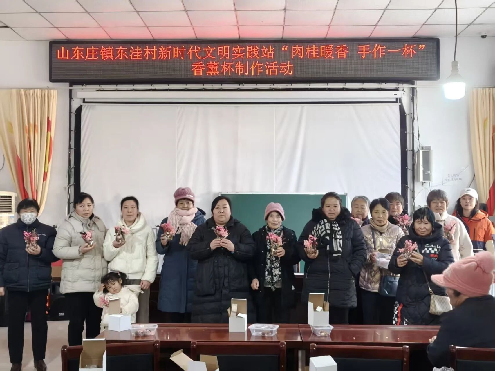 在轻松愉快的氛围中,村民们认真投入,将肉桂、松塔、柑橘片等材料细心组合,搭配干花、松枝进行装饰,并滴入喜爱的精油。不一会儿,一个个精致独特的香薰杯陆续完成,清雅香气缓缓弥漫,每一件作品都凝聚着个人的巧思与创意。活动最后,大家手捧自己的作品合影留念,脸上洋溢着喜悦与自豪的笑容。