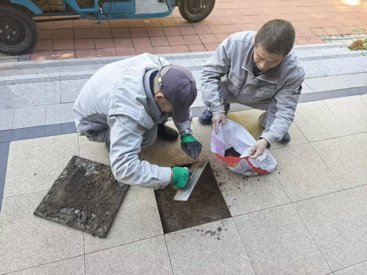 为最大限度减少对居民出行的影响,物业迅速制定“快速修复方案”,当天下午便调配好同型号防滑地砖、水泥、填缝剂等维修材料,组织专业维修人员进场施工。