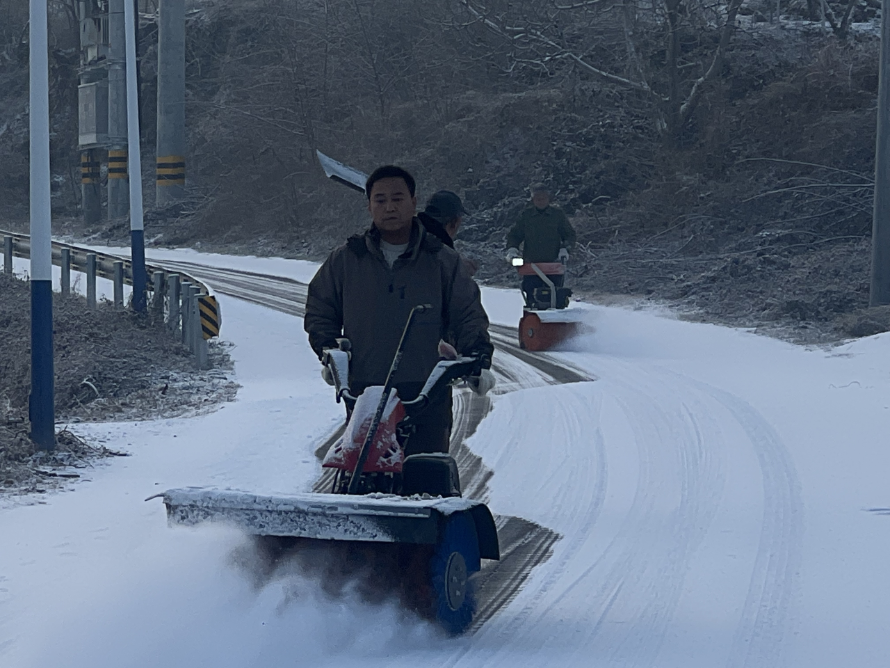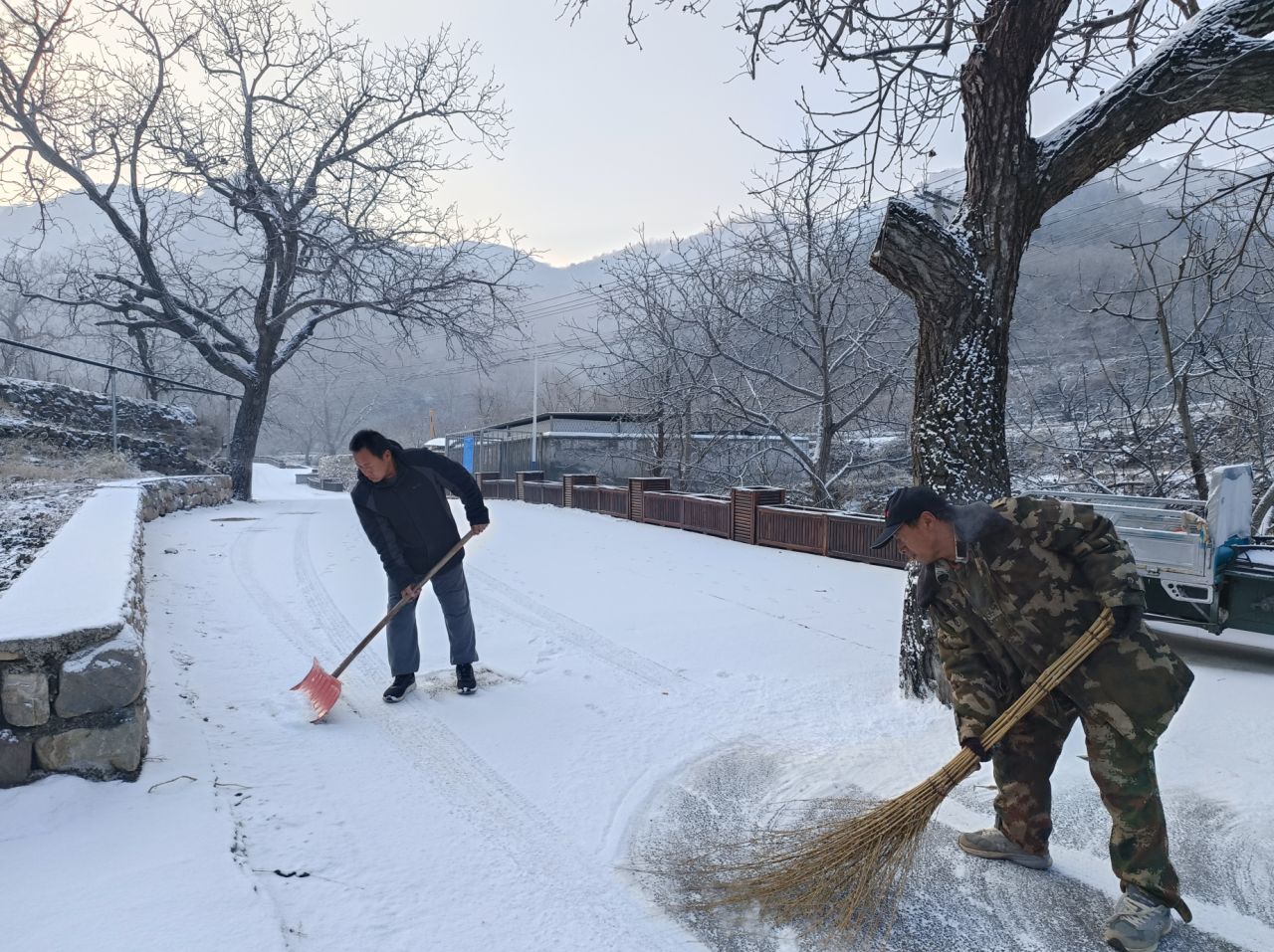 受冷空气影响,2025年12月23日,北京市平谷区迎来降雪天气。皑皑白雪覆盖了山川田野,在增添冬日韵味的同时,也给镇域内道路通行和群众生产生活带来一定影响。雪情就是命令,平安就是责任。大华山镇党委、政府高度重视、迅速响应,第一时间启动扫雪铲冰应急预案,组织动员全镇各方力量,以高度的责任感和紧迫感,全力开展清雪保畅工作,确保辖区道路安全畅通、群众出行平安有序。