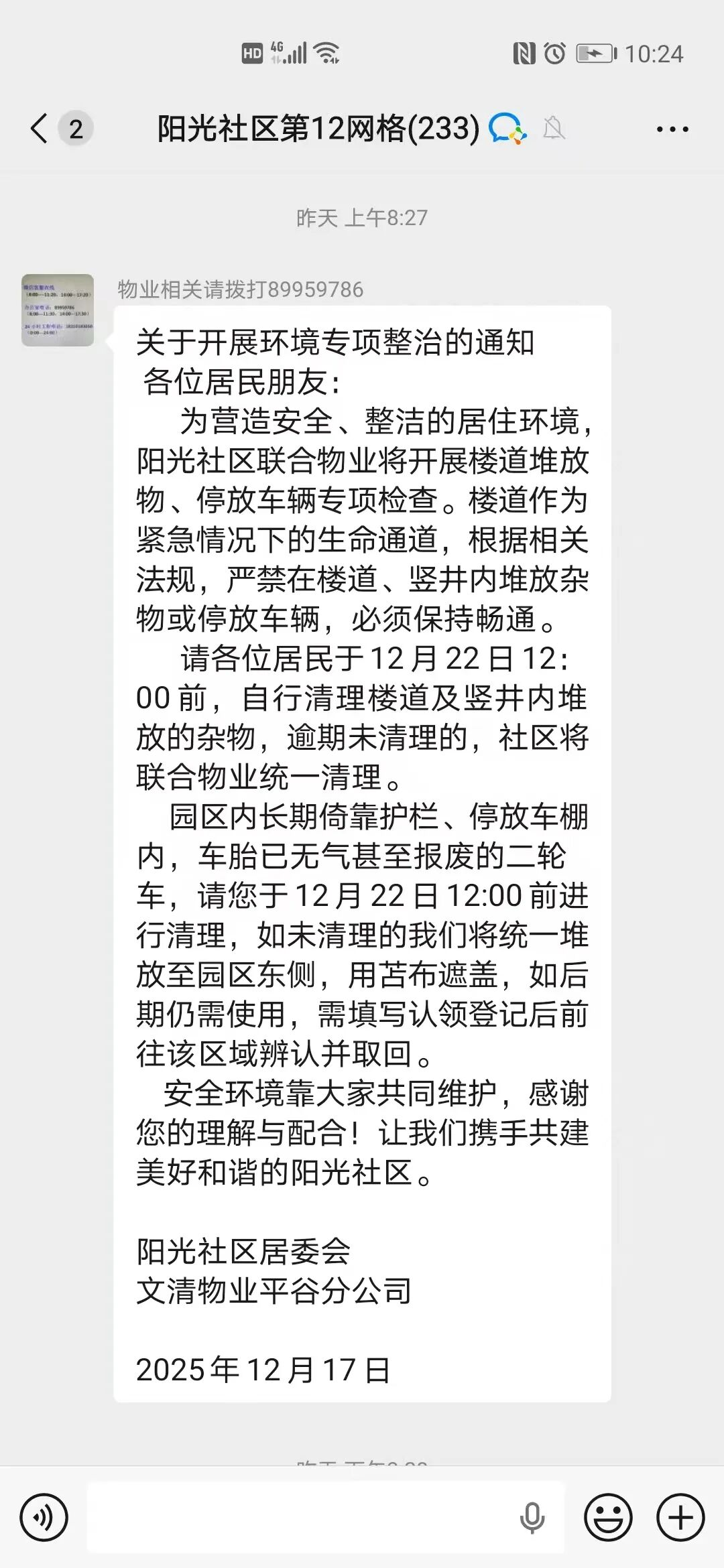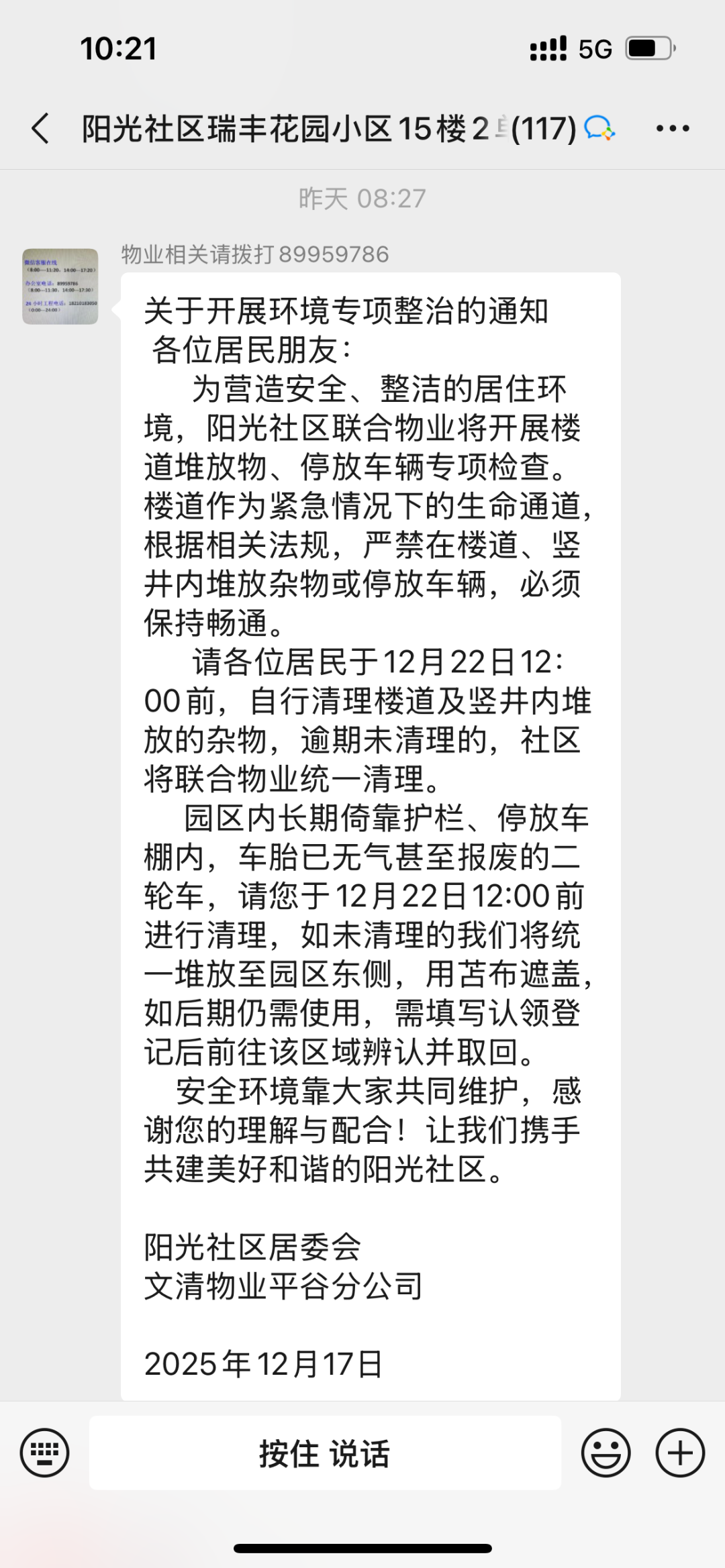 行动开展前,社区工作人员提前谋划、主动作为,通过在小区单元楼门口张贴通知、居民微信群群发消息等方式,向居民详细告知此次整治行动的重要性,引导居民自觉对楼道内、消防通道旁的私人物品进行自行清理,营造“人人知晓、主动参与”的良好氛围。