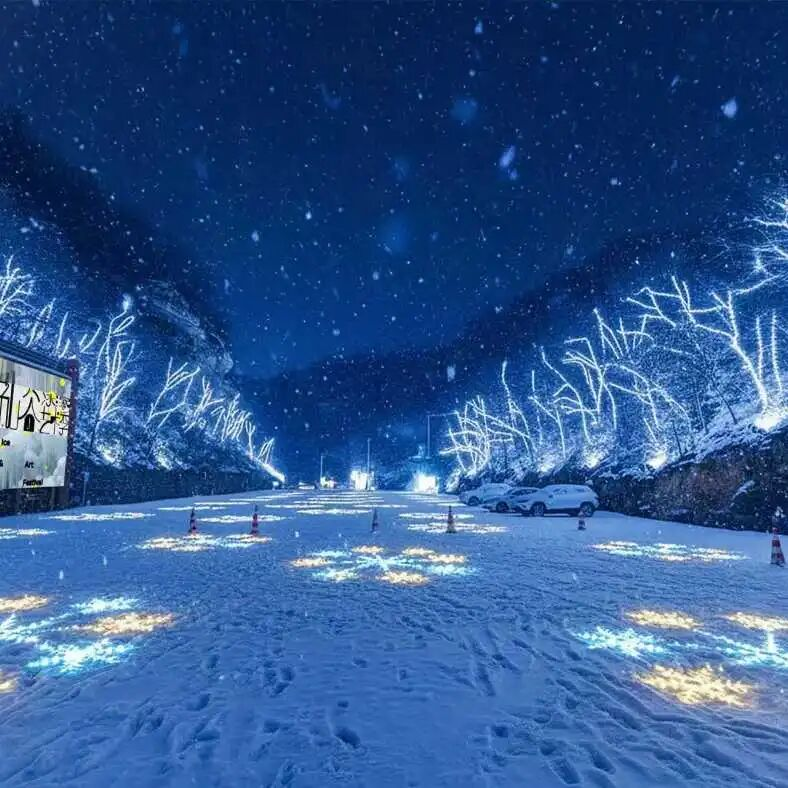 地面投影趣味盎然。灵动的草莓、翩跹的蝴蝶、清雅的雪花……光影图案铺洒途中,成为孩子们嬉戏追逐的快乐背景,增添互动妙趣。