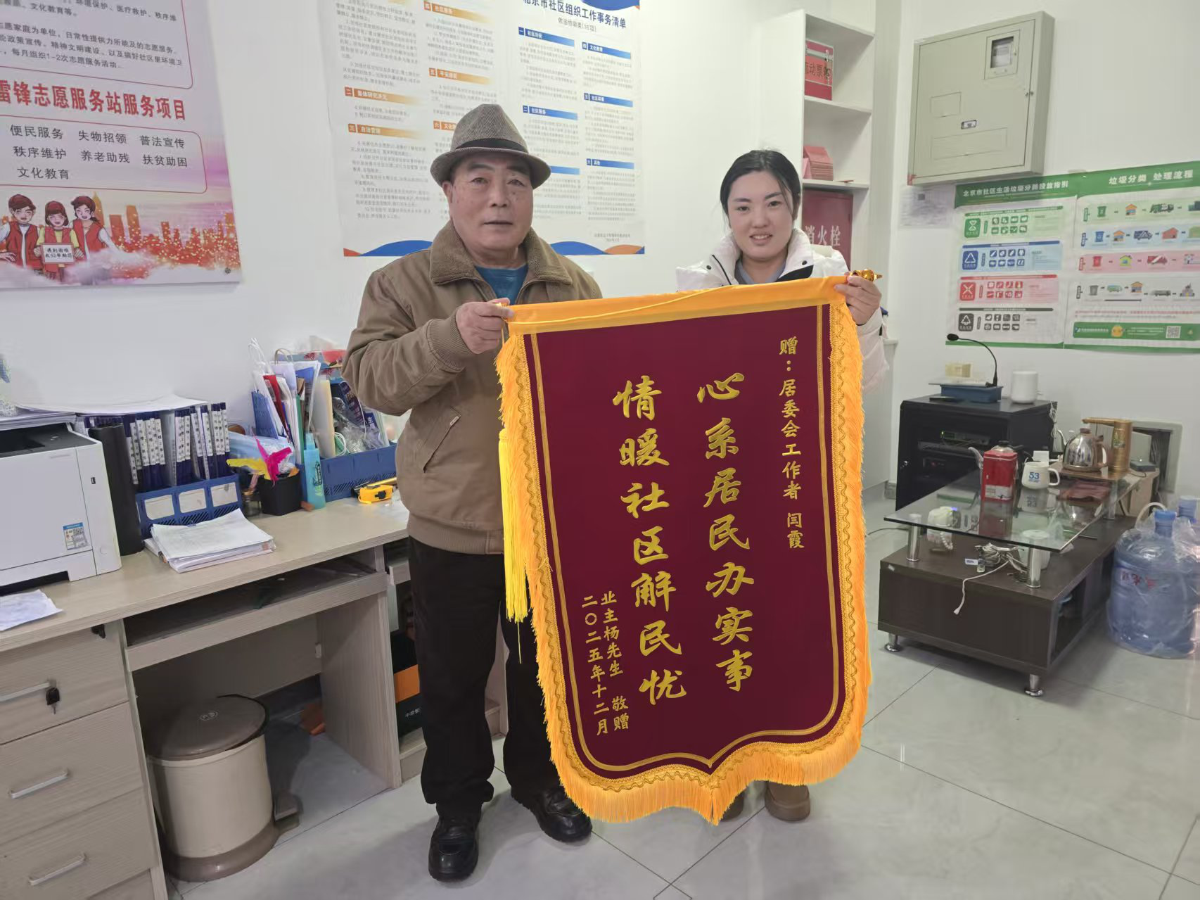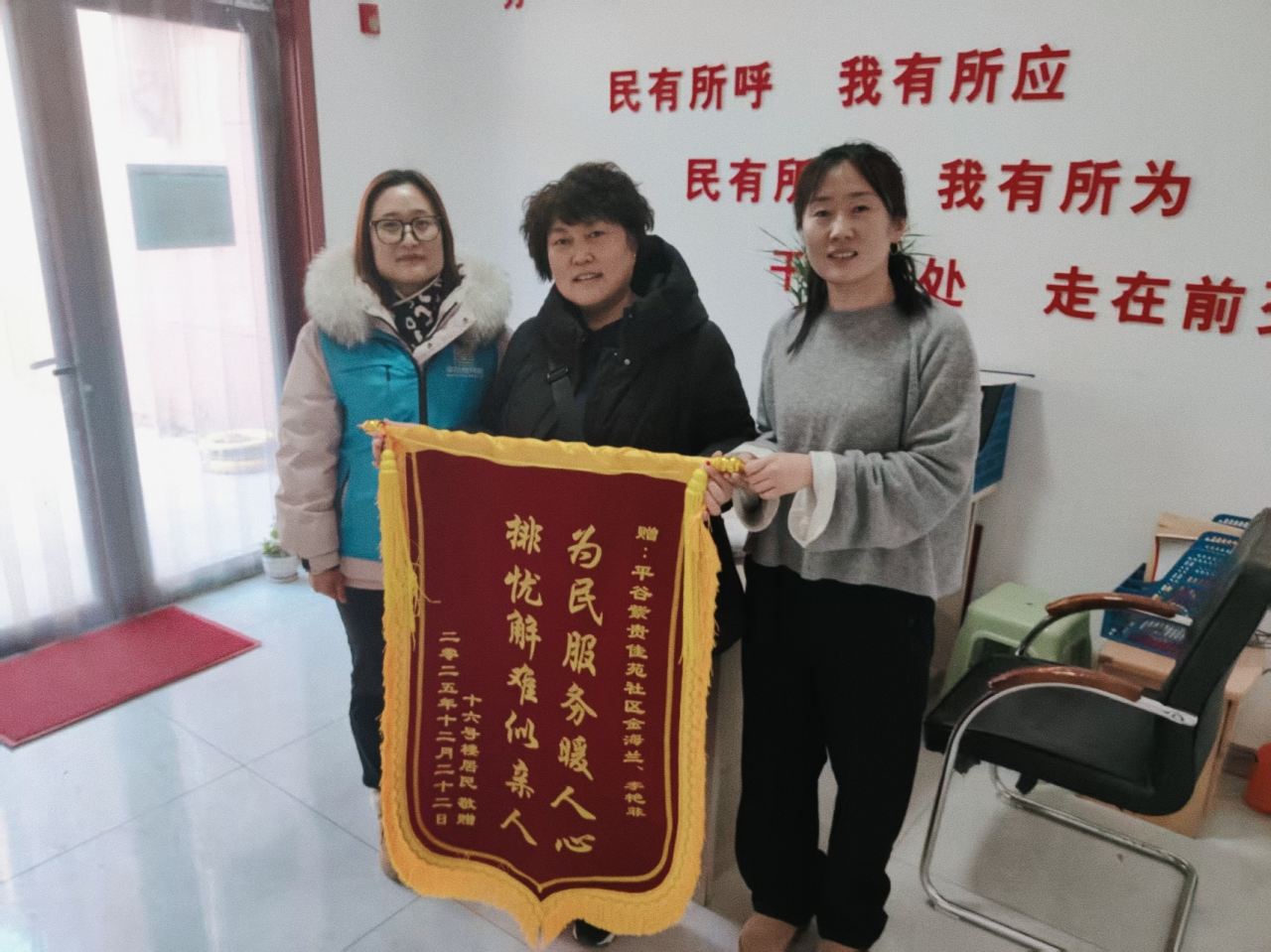 “我爸说头和心脏疼,我在市里赶不回去,能麻烦你去看看吗?”一天,网格员小金接到居民王女士焦急的来电。她立即赶往老人家中,确认状态后第一时间向王女士报平安。但想到病情不容耽搁,她主动提出:“我先送大爷去医院检查,放心些。”在社区协调下,她与同事护送老人就医,全程陪同挂号、检查,直到王女士赶到医院才悄悄离开。几天后,一面写着“为民服务暖人心、排忧解难似亲人”的锦旗,悄然送到了居委会。