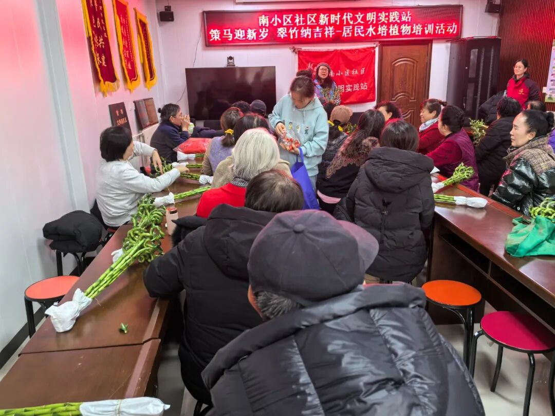 策马迎新岁 翠竹纳吉祥“策马迎新岁 翠竹纳吉祥”,南小区社区邀请园艺专业讲师,现场教授富贵竹水培植物的品种挑选、容器适配、根系修剪等知识,重点演示换水周期、营养液配比及冬季控温控光要点,同时针对黄叶、烂根等常见问题给出解决办法,并手把手指导居民进行实操。居民们热情参与,认真实操并不时互相交流心得。大家纷纷表示既学会实用技能,又收获了寓意吉祥的绿植。