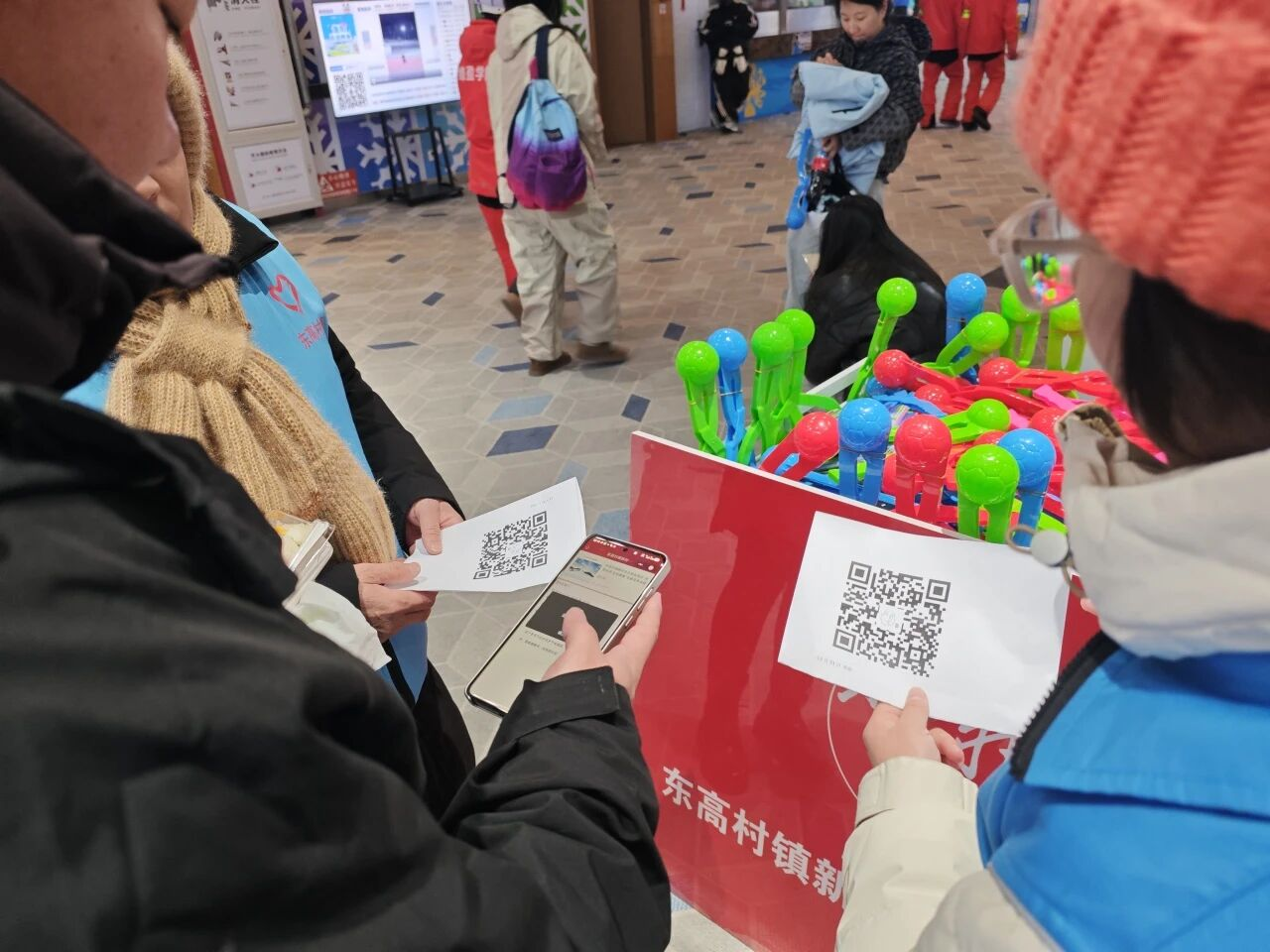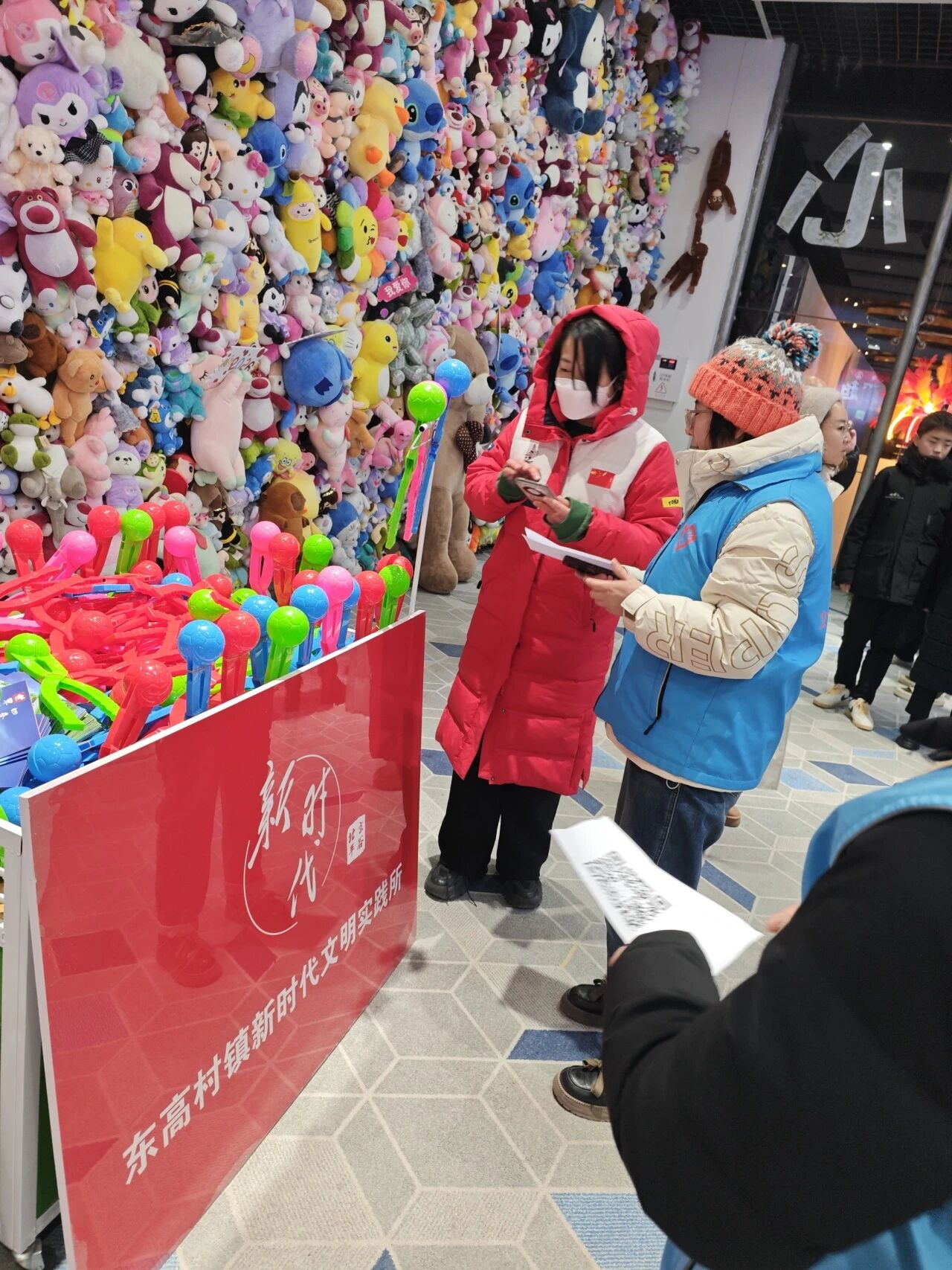 本次活动精准把握跨年夜流量契机,创新采用“线上引流+线下互动”双轨推进模式:线上依托“新时代文明实践站小程序”提前发布活动资讯,广泛吸引群众关注参与;线下在活动现场设置专属服务点位,引导群众有序签到参与。志愿者们向现场游客发放东高村镇农文旅宣传手册,详细介绍镇域内休闲采摘等特色文旅线路,推动文明实践与乡村文旅发展深度融合。同时,现场还免费发放戏雪玩具,让游客沉浸式体验冰雪乐趣,收获满满欢乐。