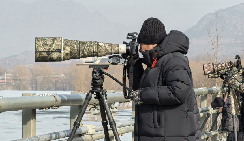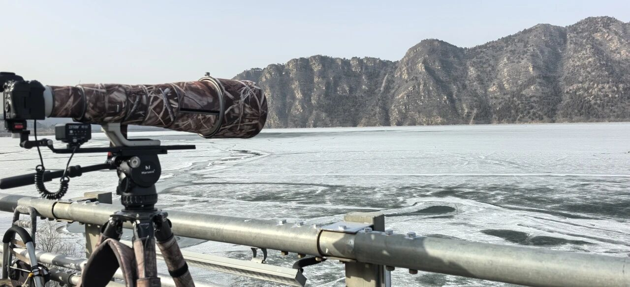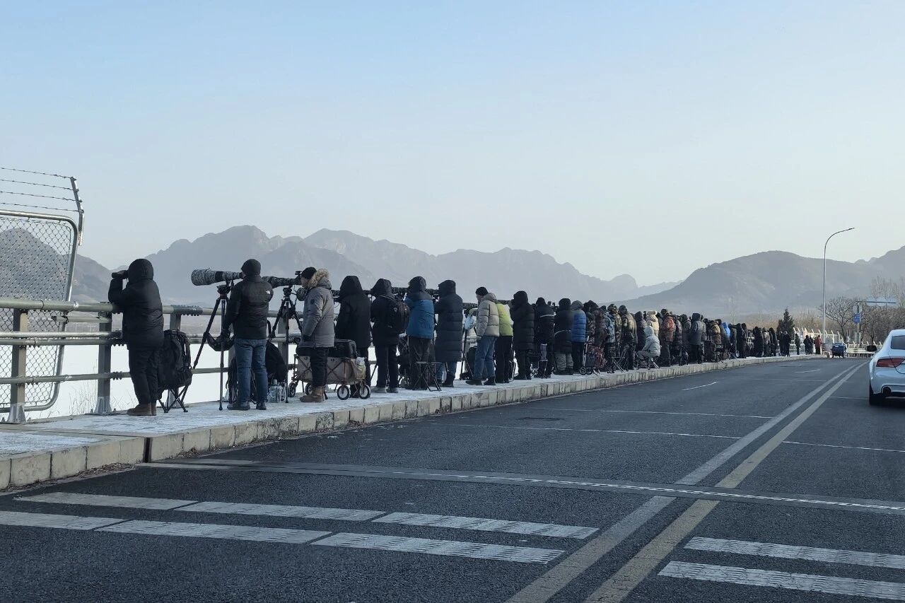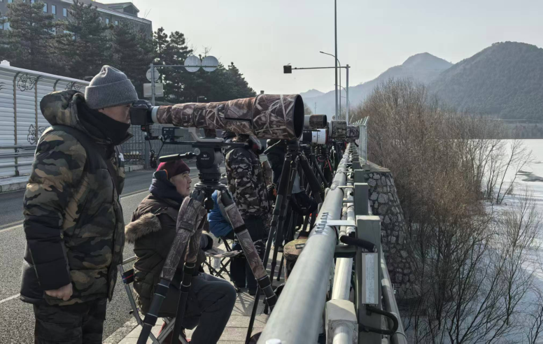 在西峪水库大桥上,众多摄影爱好者架起了“长枪短炮”,他们的镜头对准的正是雪景中飞舞的白尾海雕,期待捕捉这难得的冬日画面。