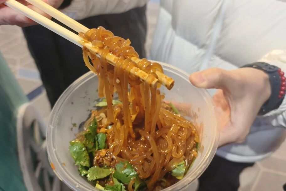 展区另一侧,北京渔阳国际滑雪场的特色网红干拌酸辣粉展台前人头攒动、热闹非凡。上方悬挂的“滑雪不重要,快来咥粉!”趣味标语,巧妙串联冰雪运动与特色美食,瞬间勾起代表们的好奇心。刚出锅的酸辣粉鲜香扑鼻,引得众人纷纷驻足品尝。与此同时,滑雪场同步推出面向韩企的冰雪体验专属优惠,以冰雪为媒进一步深化双方互动联结。