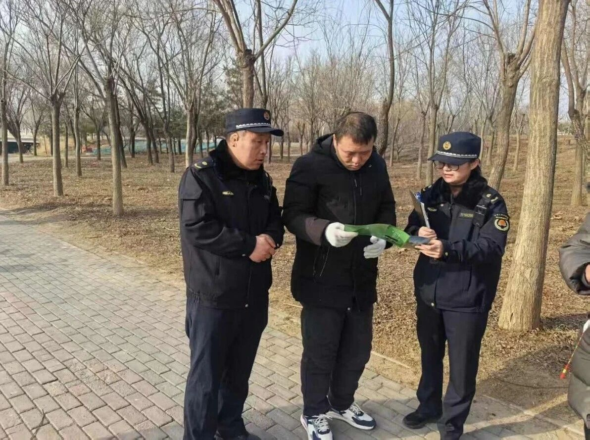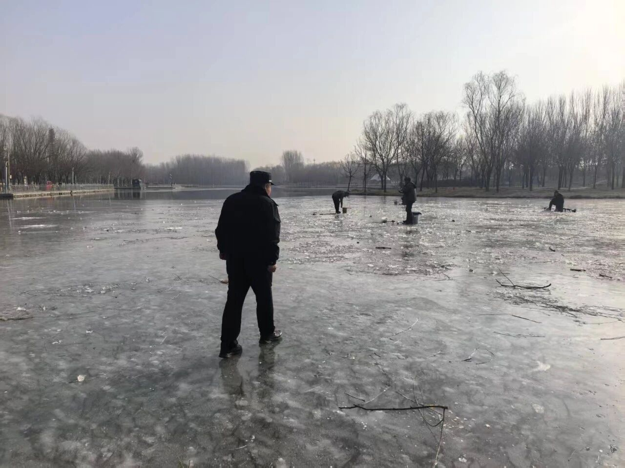 执法人员对现场冰钓市民进行耐心劝导,详细讲解野冰活动的安全隐患,并发放文明游园宣传折页,明确告知小龙河公园并非指定滑冰或钓鱼区,违反规定将面临相应的行政处罚。