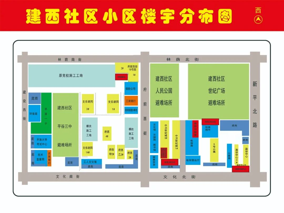 建西社区隶属于平谷区滨河街道办事处,地处平谷城区核心区域,东至文化南北街,西至林荫南北街,南至建设西街,北至新平北路,辖区面积0.49平方公里。辖区内共有居民楼栋23栋,总户数2574户(其中新建楼栋住户602户),常住人口4330人。