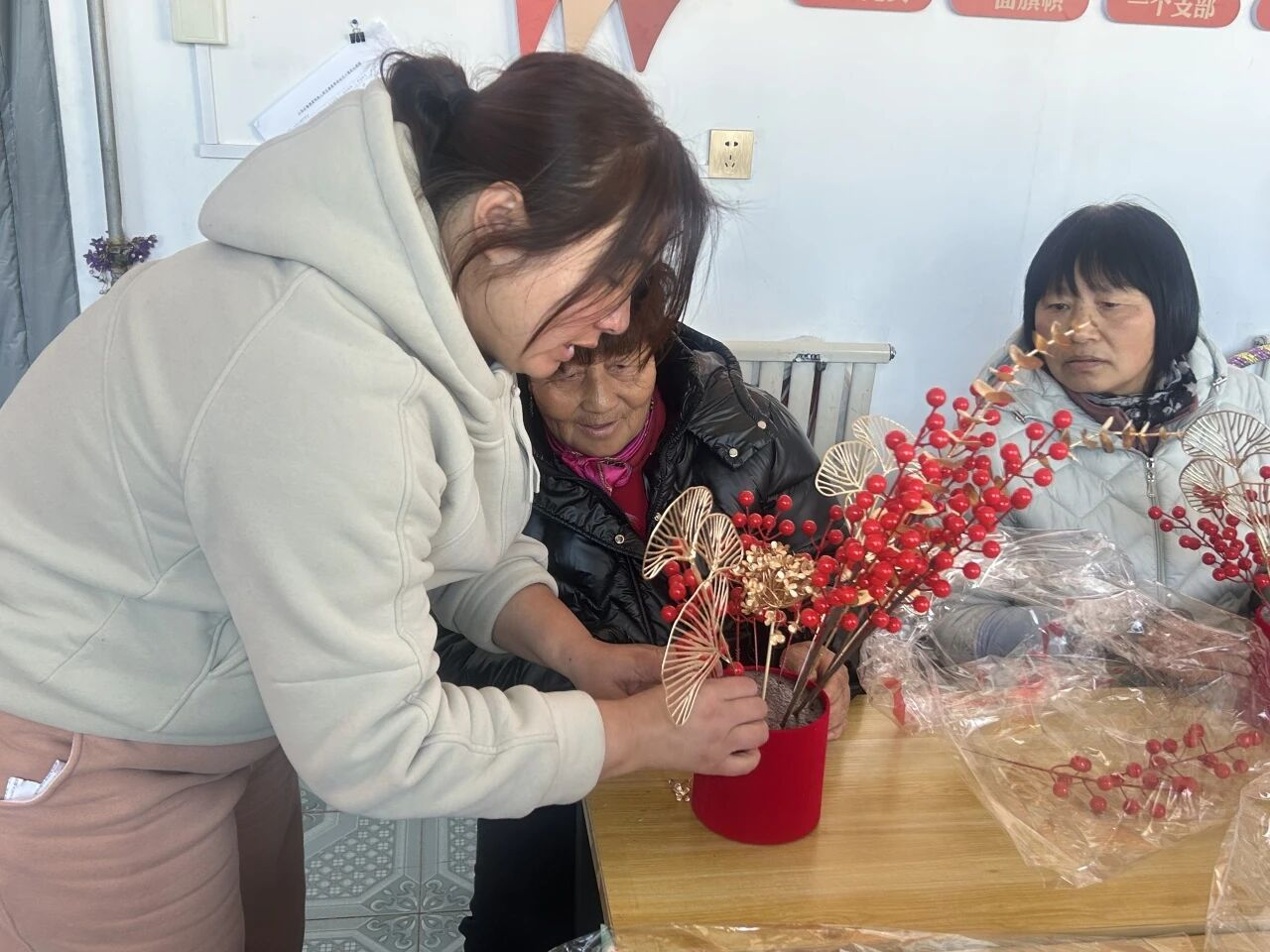 活动现场,红色抱抱桶、仿真冬青红果、金色装饰枝以及写有“福满新居”“招财进宝”等吉祥祝福的挂饰整齐摆放,处处洋溢着喜庆祥和的节日氛围。在老师的耐心讲解和分步演示下,参与者认真投入创作——固定花泥、搭配花材、点缀挂饰。大家相互鼓励、彼此协助,手中的材料逐渐变成一个个精美别致、福气洋溢的作品。有的巧妙穿插红果与金枝,营造出热闹饱满的视觉效果;有的精心调整挂饰位置,让“福”字恰到好处地点缀其间,每一件作品都承载着大家对美好生活的向往与巧思。