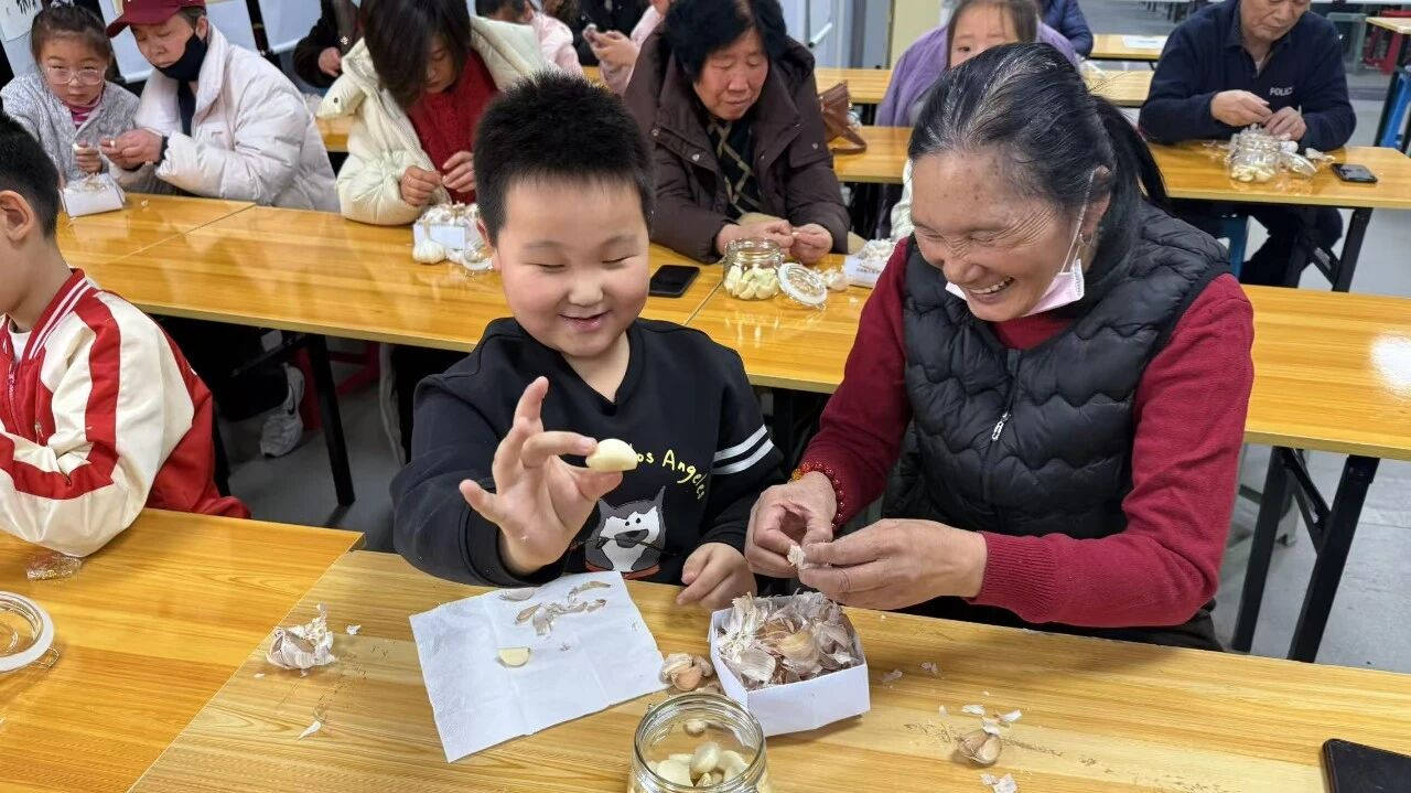 “不仅学会了腌腊八蒜,还和邻居熟络了,太有意义了。”带着小孙女来参加活动的居民李阿姨一边拧紧罐盖,一边笑着分享。老人和孩子们围在一起忙活不停,你一言我一语交流着各家的腊八习俗,畅谈新年规划,欢声笑语此起彼伏。一瓶瓶灌满洁白蒜瓣与酸甜料汁的玻璃罐被逐一封存,罐中不仅承载着腊八节的传统味道,更将醇厚的邻里情谊与对新春的美好期盼,一并锁进了这份专属年味里。