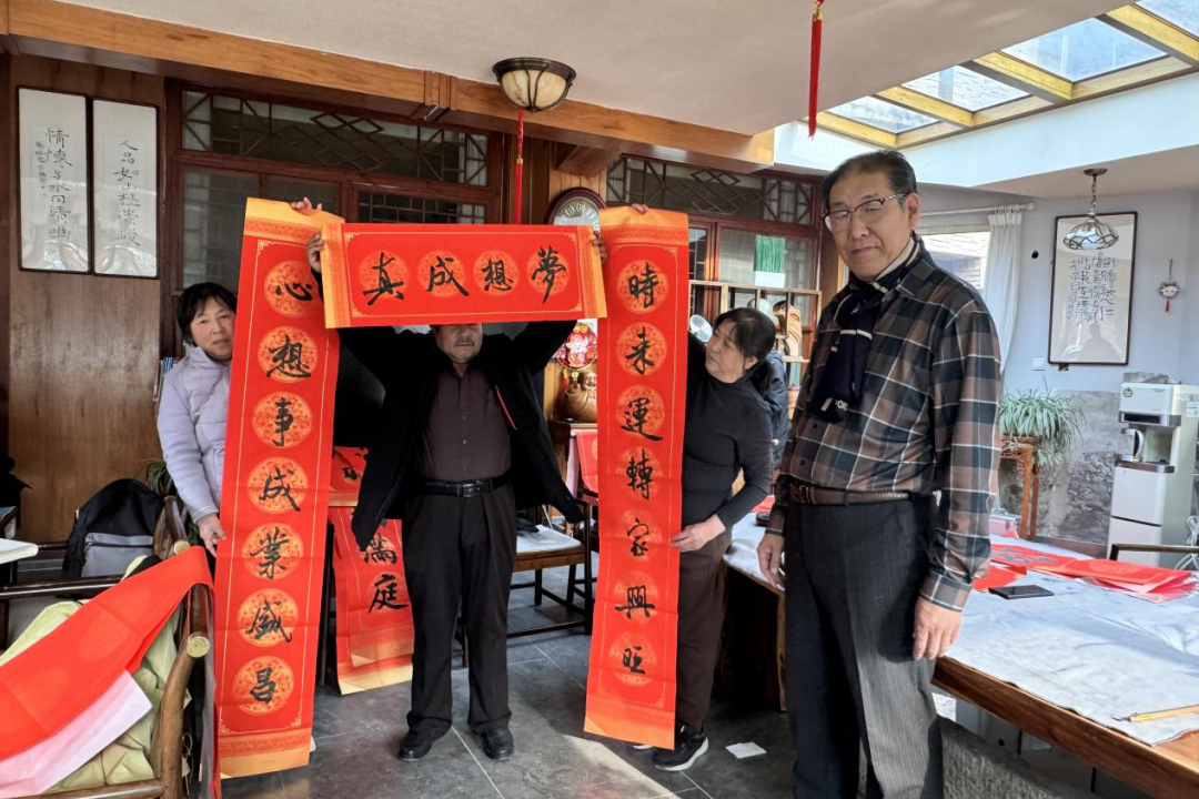村民们怀着喜悦的心情有序排队,有的驻足观赏书法家创作,不时发出阵阵赞叹;有的与邻里交流对新年的期盼,分享着挑选春联的心得。