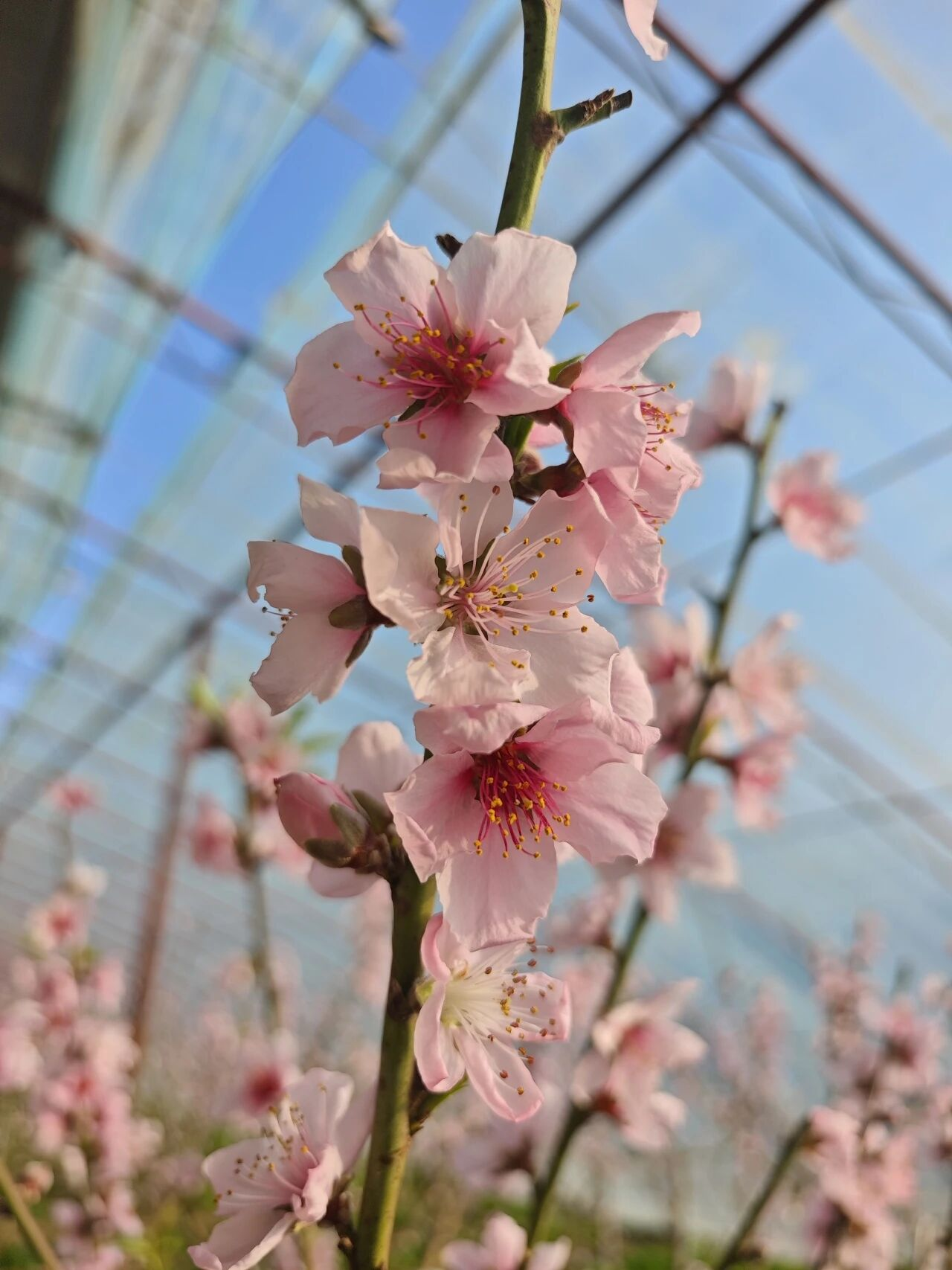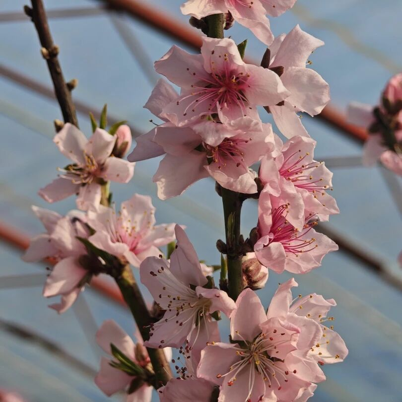 走进温室大棚,只见这里的桃花正艳,阳光透过温室透明的穹顶,斑驳陆离地洒落,与桃花的柔美身姿交织在一起,勾勒出一幅幅如梦似幻的绝美画卷。蜜蜂在花丛间忙碌采蜜。与露天桃树相比,温室大桃的花期提前了近两个月。