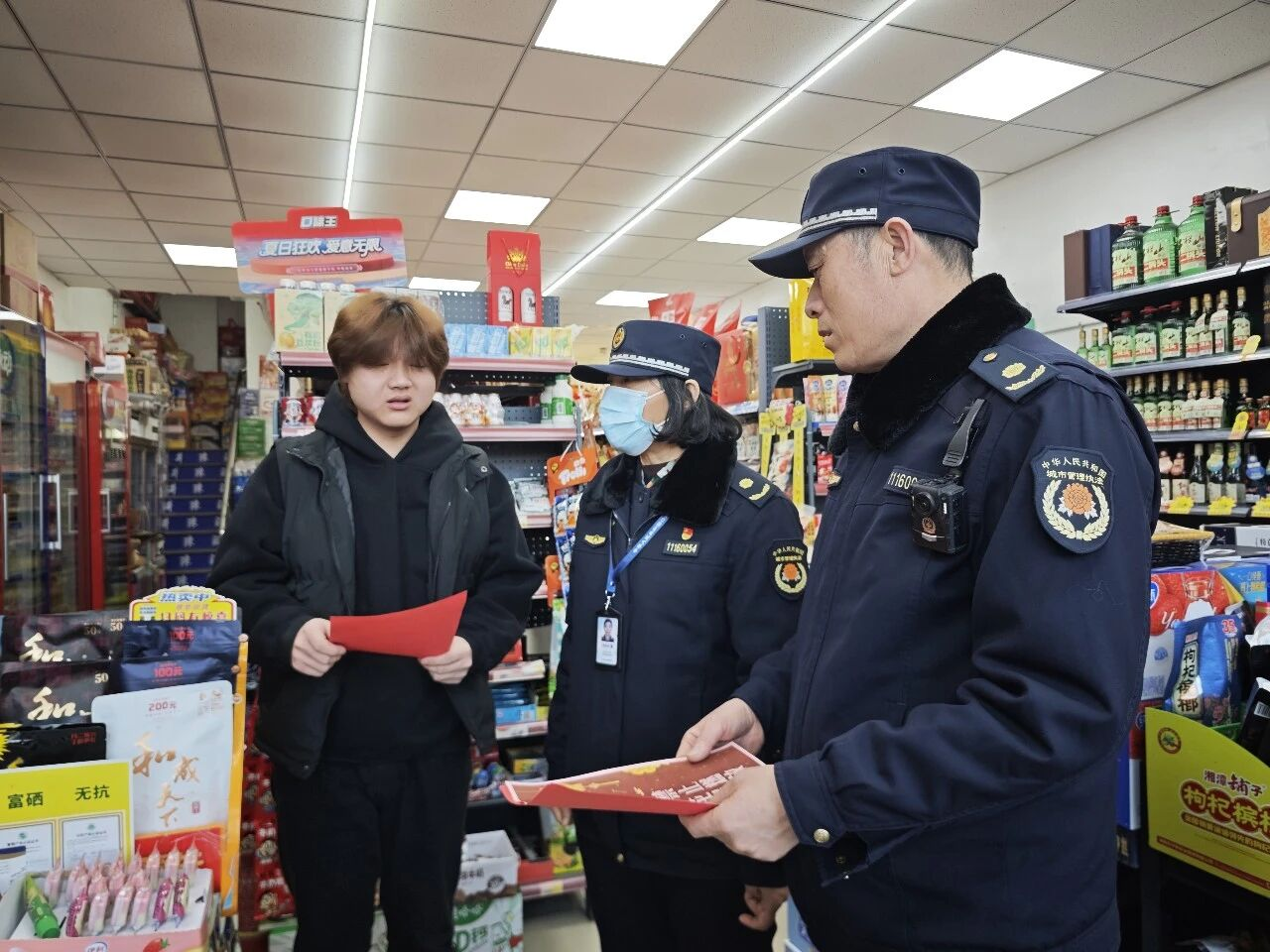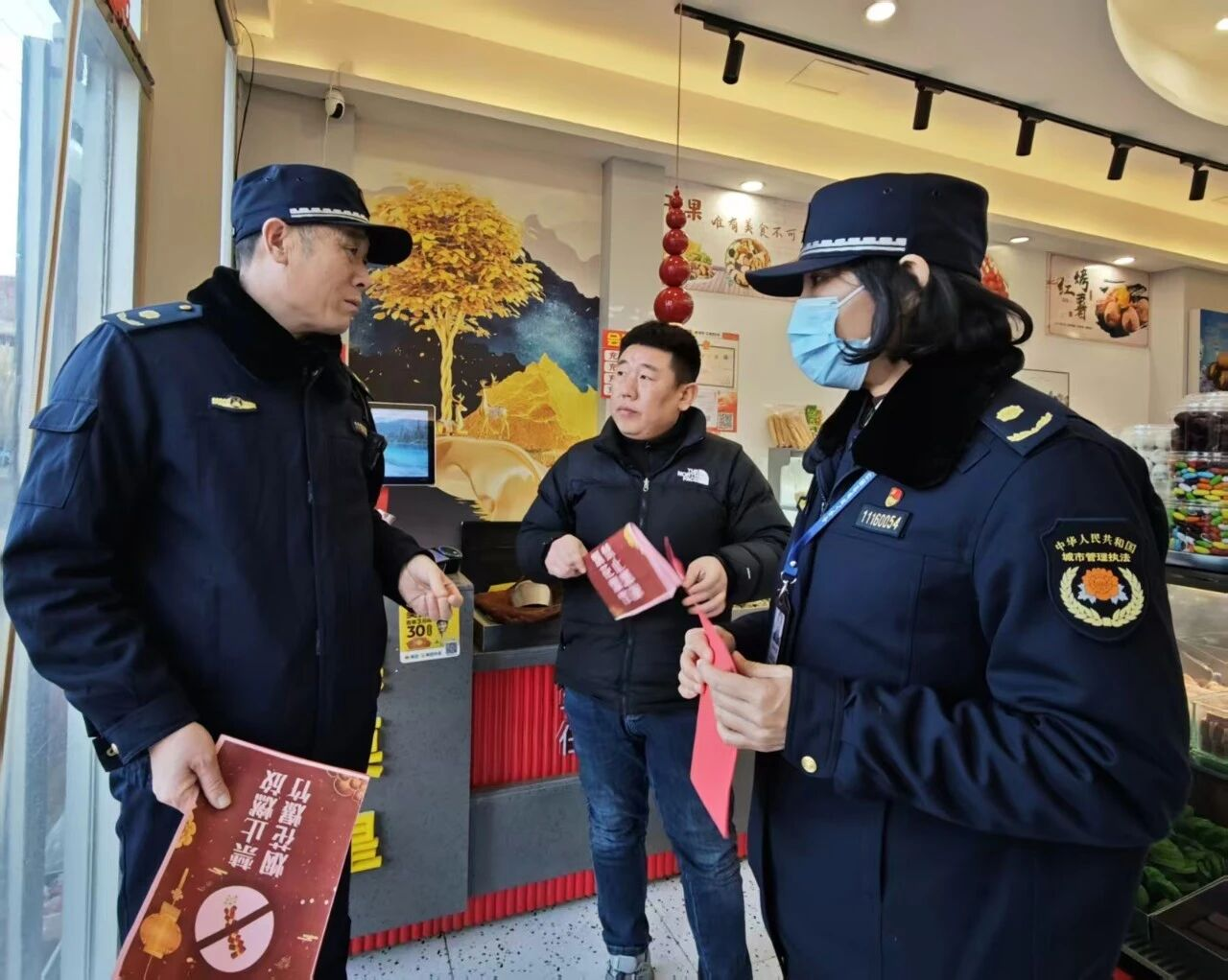 过程中,执法队员逐户上门宣传,通过发放禁放烟花爆竹倡议书、宣传页,向商户负责人及居民详细阐释烟花爆竹禁放的相关政策规定及违规燃放可能带来的安全风险、环境污染和法律责任,并结合生动案例引导商户自觉遵守规定,争做文明守法经营者。