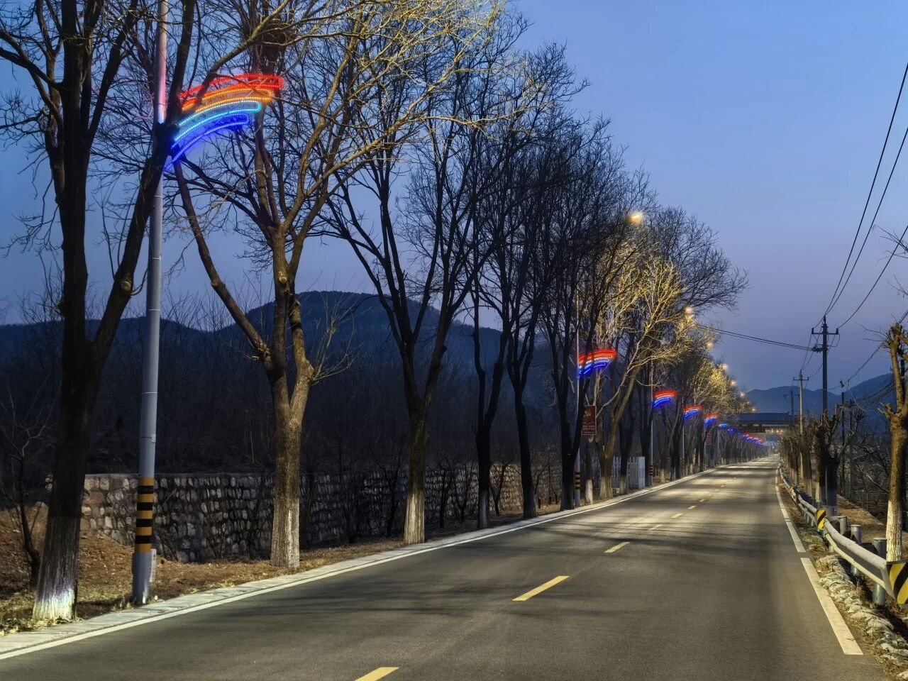 在原有路灯设施的基础上加装彩虹弧线装饰