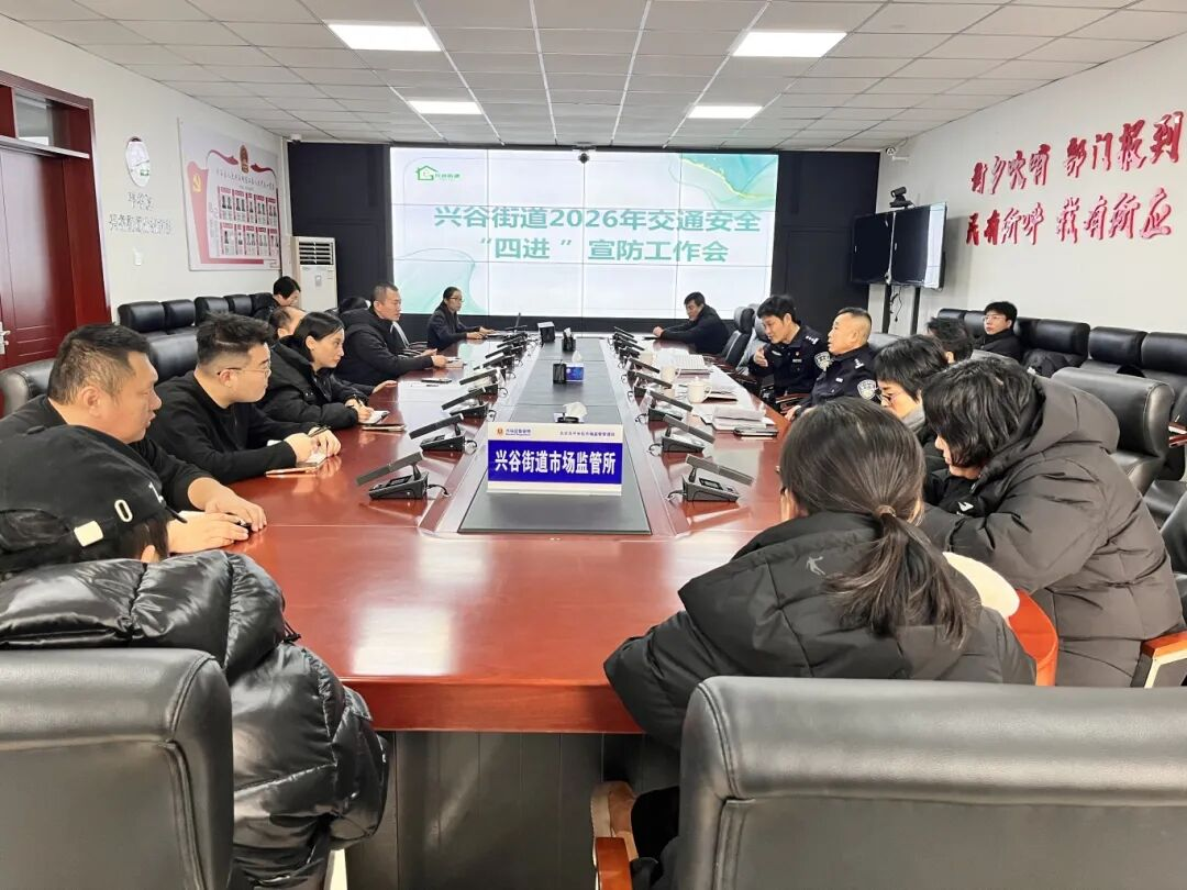为扎实推进辖区交通安全管理工作,提升居民安全出行意识,1月29日上午,兴谷街道联合区交通支队组织召开交通安全“四进”宣防工作会。兴谷街道办事处主任成波、区交通支队副支队长马涛、副支队长蒋文博出席会议,各社区(村)安全专干参加会议。