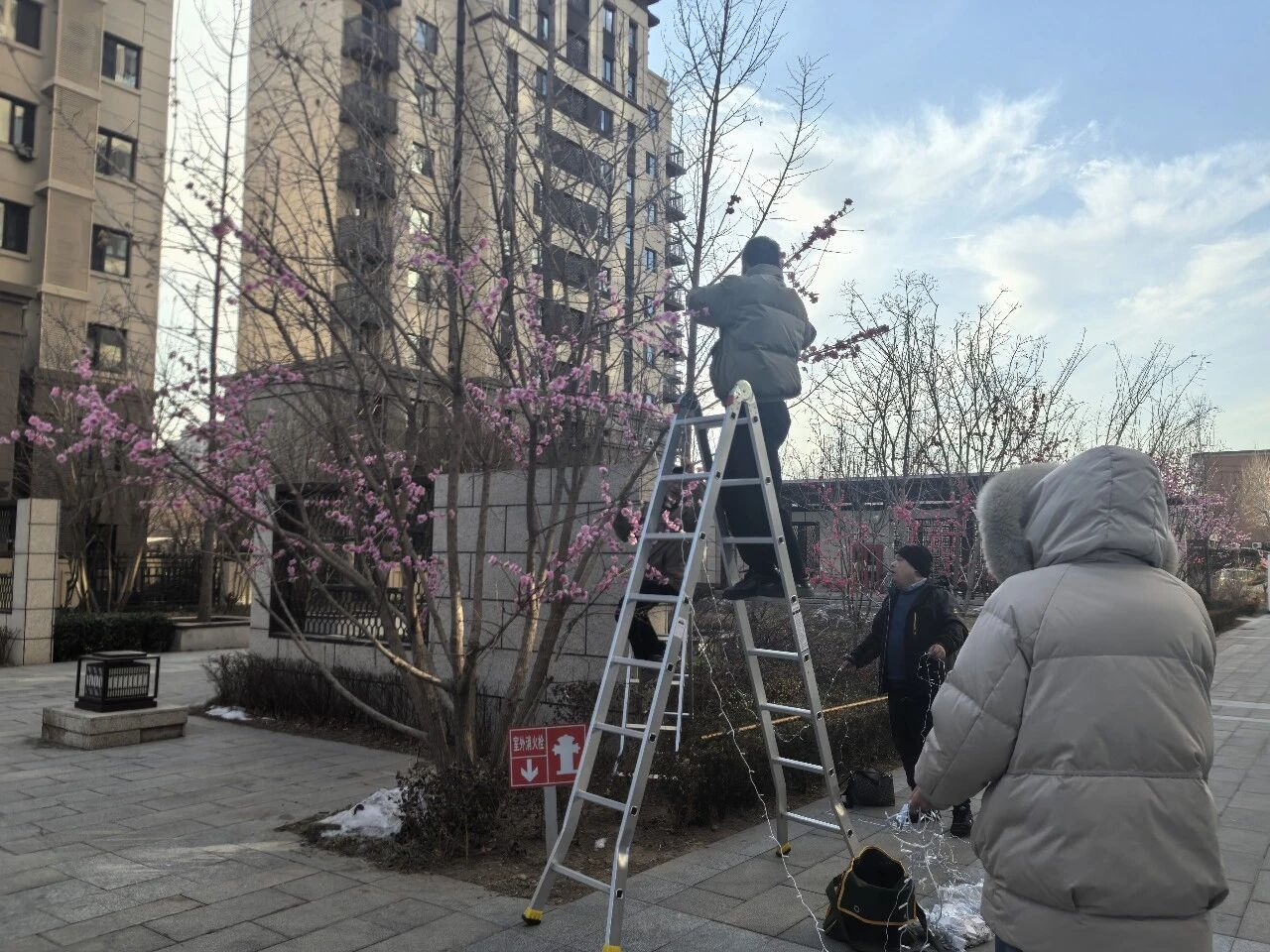 工作人员化身“装扮师”,穿梭在小区主干道、楼栋出入口等区域,分工协作、有条不紊地张挂红灯笼、布置彩色灯带。大家手提灯笼、牵拉彩灯,细心调整每一处细节,让红灯笼高高挂起,彩灯带蜿蜒环绕。经过连日忙碌,一盏盏喜庆的灯笼、一条条缤纷的彩灯将小区装点得格外靓丽,原本宁静的社区瞬间洋溢着浓浓年味,成为冬日里一道温暖的风景线。