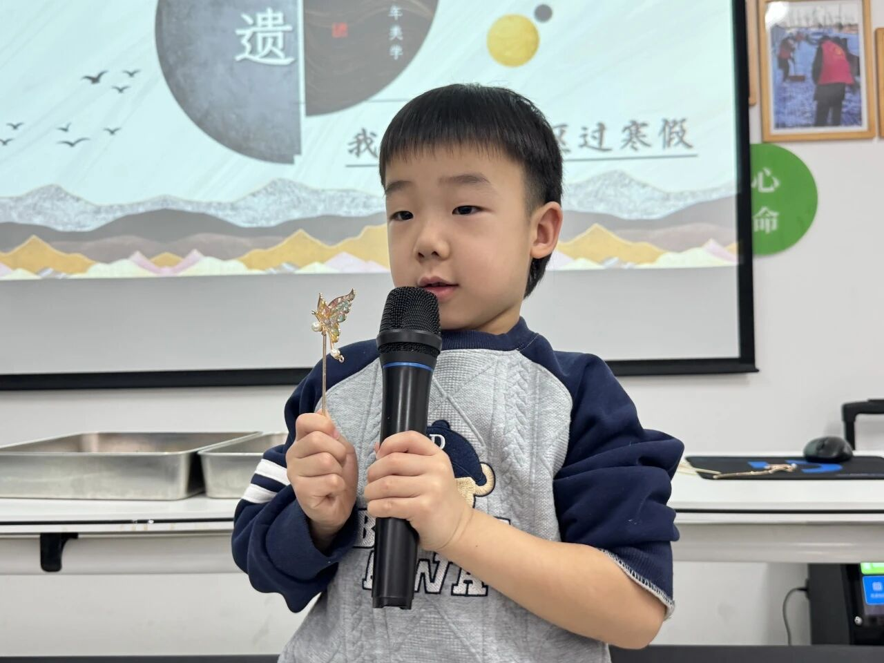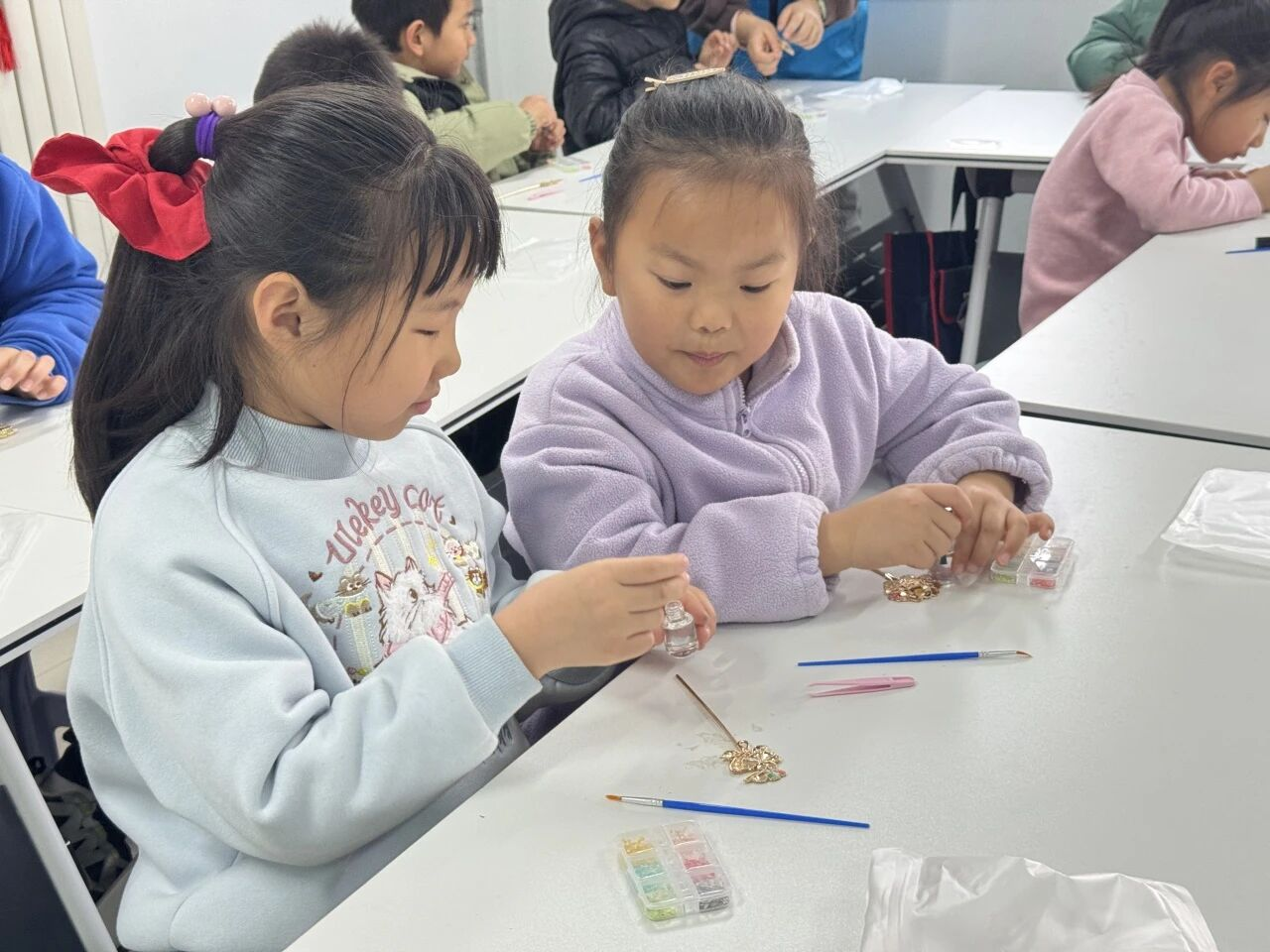 活动中,老师为孩子们讲解了螺钿技艺的历史渊源与文化内涵。螺钿作为一项源远流长的中国传统镶嵌工艺,以天然贝壳、夜光螺等为原料,经取材、切割、打磨、镶嵌等多道工序,赋予器物流光溢彩的艺术效果。老师还结合历代服饰文化,介绍了螺钿饰品在中华审美史上的独特地位,加深了孩子们对这项传统工艺的理解。