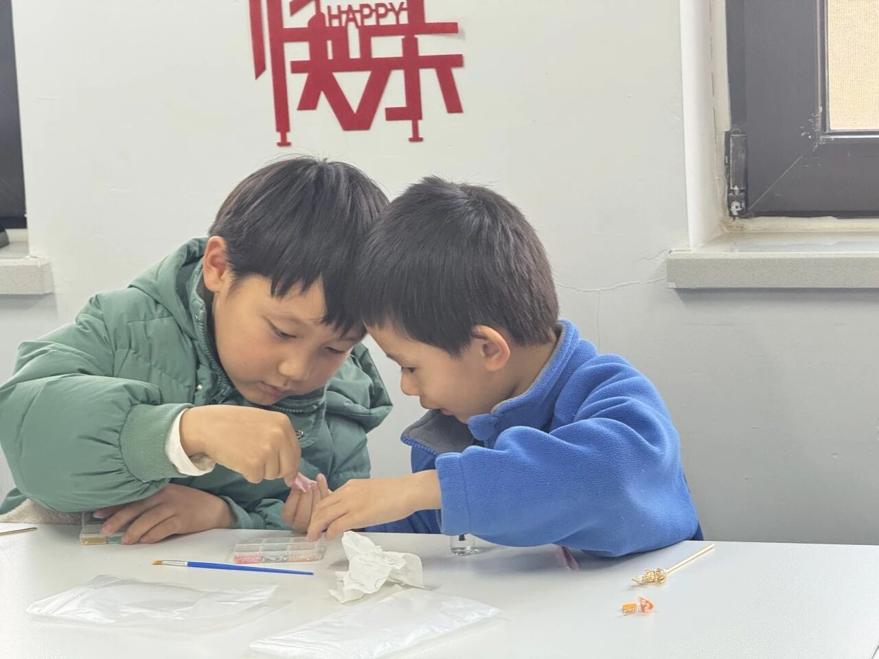 在实践环节,老师逐步示范发簪制作流程,从图案设计、选配螺片,到安全使用工具进行粘贴固定,孩子们听得认真、做得投入。一片片素雅的螺钿材料,经过他们细心拼贴、巧妙布局,渐渐在发簪上绽放出绚丽光华,方寸之间尽显华彩韵味。