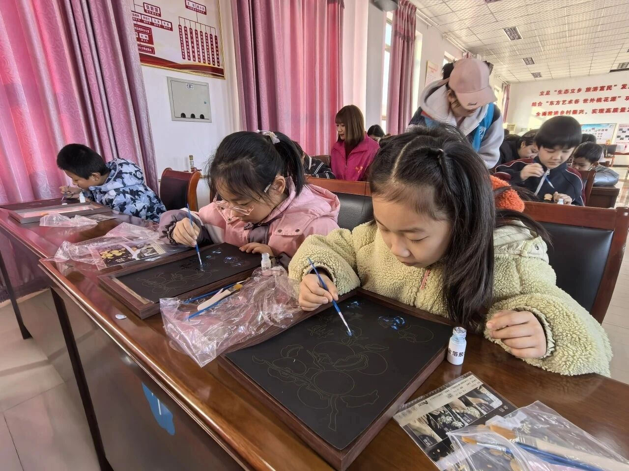 “胶水要沿着线条涂匀,晾到微黏再盖金箔哦!”黄松峪乡新时代文明实践所里,工作人员手把手教孩子做烧箔画。案台上,特制胶水、金箔纸、软毛刷整齐排列,这是城里孩子喜欢的非遗体验,如今乡村娃也能亲手尝试。