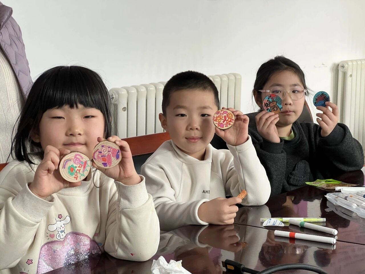动手环节更热闹,有人在年轮旁画满桃花,融入家乡的桃园美景;有人用渐变色彩模拟四季更迭,把“年轮故事”画进作品里。当木片粘上磁贴,一个个带着自然质感与家乡温度的冰箱贴诞生,“爱家乡、护自然”的情感,也跟着住进了孩子心里。