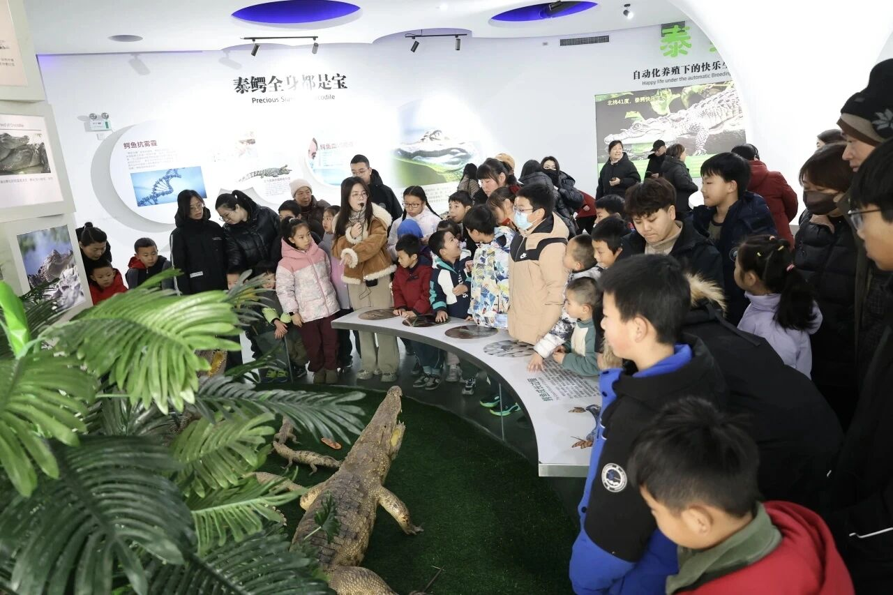 转场正大鳄鱼基地,热带暹罗鳄的“北方安家记”更让孩子们瞪大双眼。近4000条鳄鱼的“生态豪宅”里,24℃恒温系统、生态循环装置藏着“跨纬度养殖”的奥秘。讲解员化身“科普向导”,从鳄鱼进化史讲到“几乎不患癌症”的独特体质,还拿出鳄鱼骨标本让孩子触摸。“鳄鱼蛋要多少天孵化?”“冬天它们会冬眠吗?”家长和孩子一起举手提问,曾经只能在纪录片里见的“爬行动物明星”,如今成了家门口的“科普老师”。