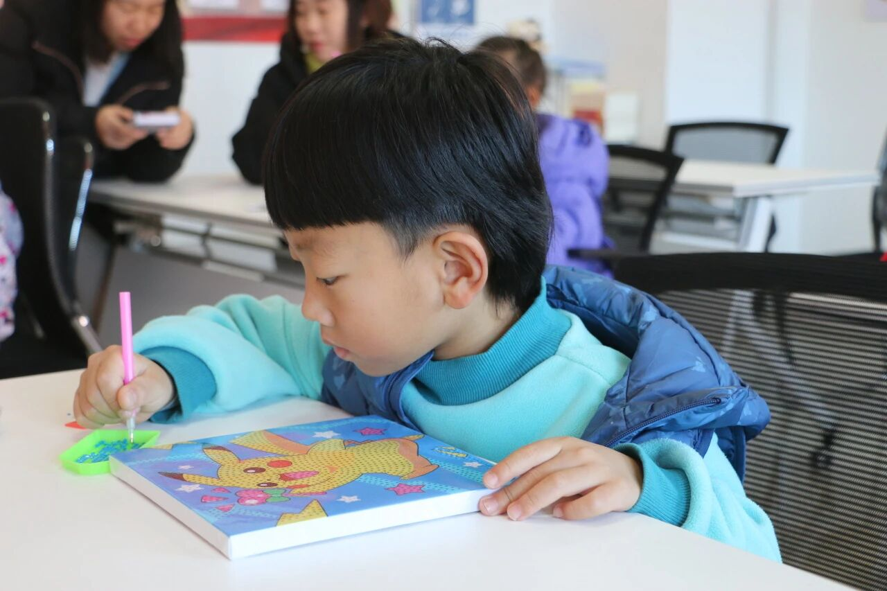 活动伊始,色彩缤纷的钻石材料与生动有趣的卡通底图迅速吸引了孩子们的注意力。在志愿者的细致讲解与示范下,孩子们认真学习点钻技巧与粘贴方法。随后,在志愿者的协助下,大家纷纷投入创作,仔细选取闪亮“钻石”,专注粘贴至对应区域。现场气氛安静而有序,偶有交流互助,洋溢温馨氛围。经过耐心制作,零散材料逐渐化作一幅幅完整亮丽的钻石画,卡通形象熠熠生辉,孩子们也展露出充满成就感的笑容。