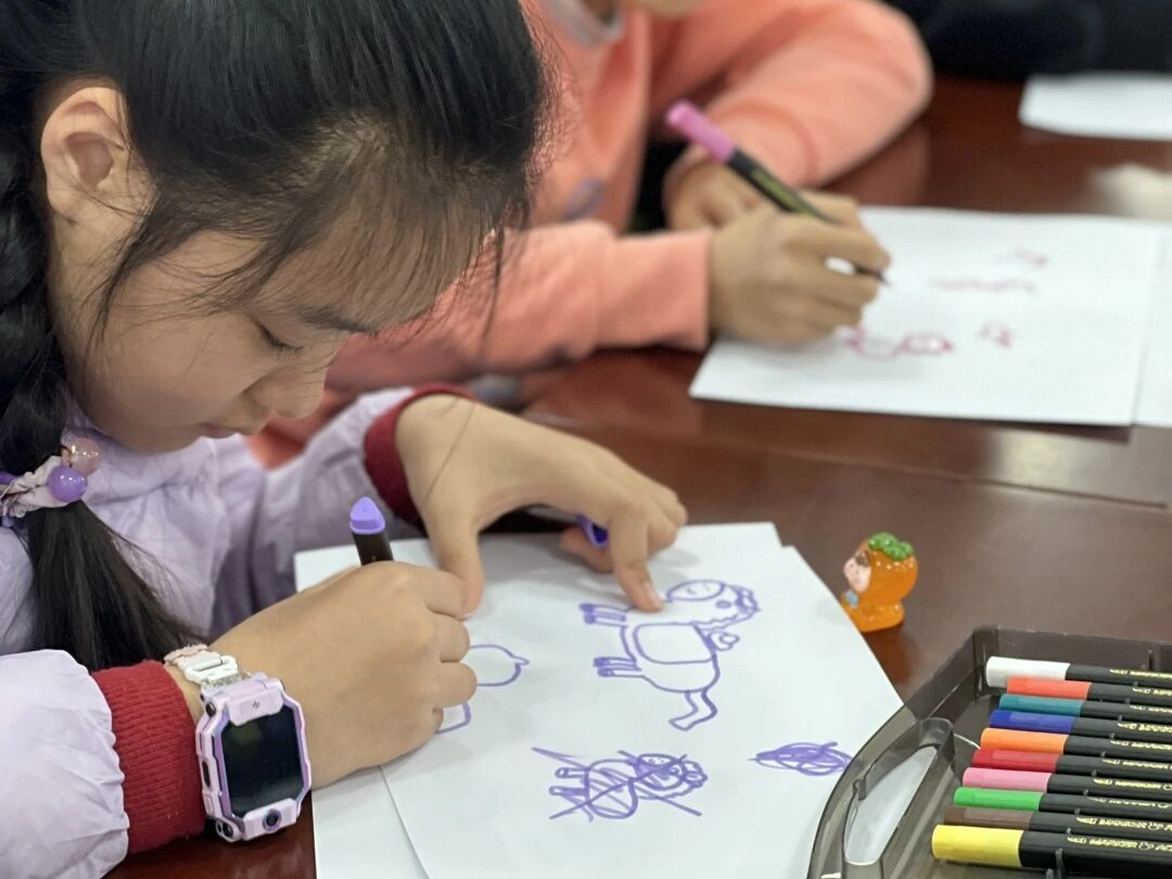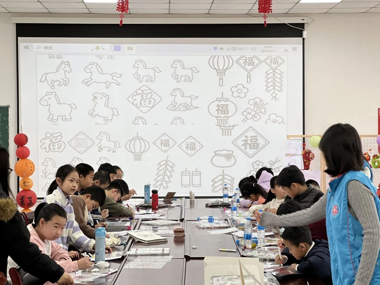 民俗科普点燃了孩子们对“马”的兴趣,紧接着,“马年画马”创意美术环节如期展开,将课堂气氛推向了高潮。孩子们迫不及待地拿起画笔、铺开画板,把对马的喜爱、对马年的美好憧憬,一笔一画倾注在画板上:有的认真勾勒矫健奔马,寄托自己奋发向上的小小志向;有的巧妙融入福字、彩绸,勾勒出喜庆满满的马年模样;还有的大胆发挥想象,画出色彩斑斓、充满童趣的“未来马”。老师们和志愿者们穿梭在孩子们中间,耐心指导每一笔勾勒、每一种涂色,课堂上既有专注创作的宁静,也有分享交流的欢声笑语,温情满满、暖意融融。