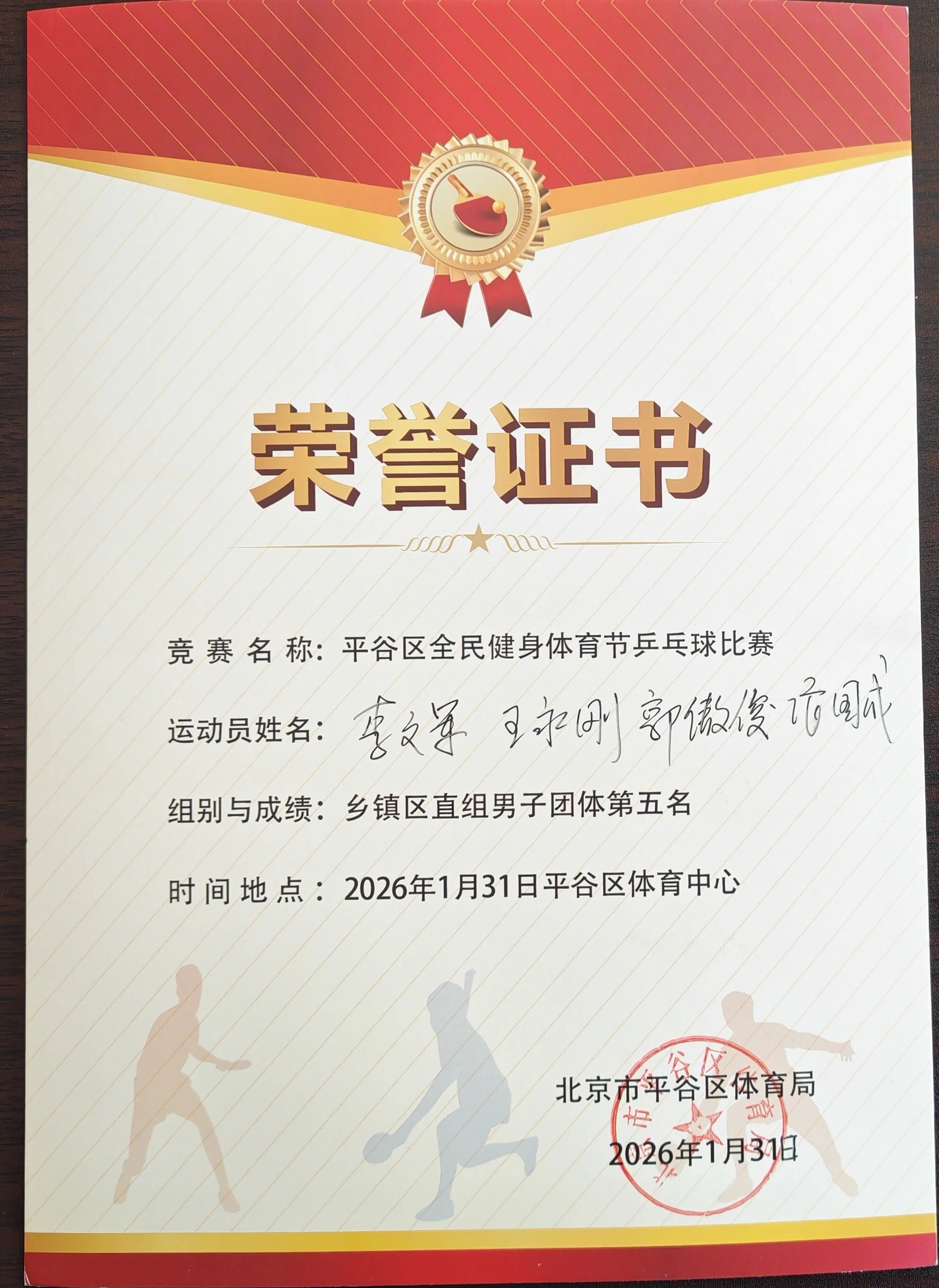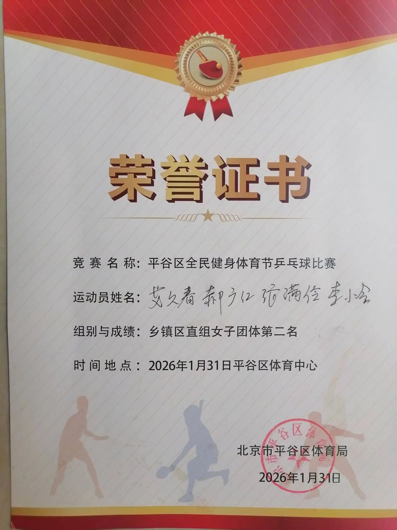近日,平谷区“迎春杯”全民健身体育节乒乓球赛圆满落幕。经过两天激烈角逐,东高村镇代表队表现亮眼、斩获佳绩,女子团体获全区第二名,男子团体获第五名;女子单打分摘第二名、第五名,男子单打拿下两个第三名、一个第五名。