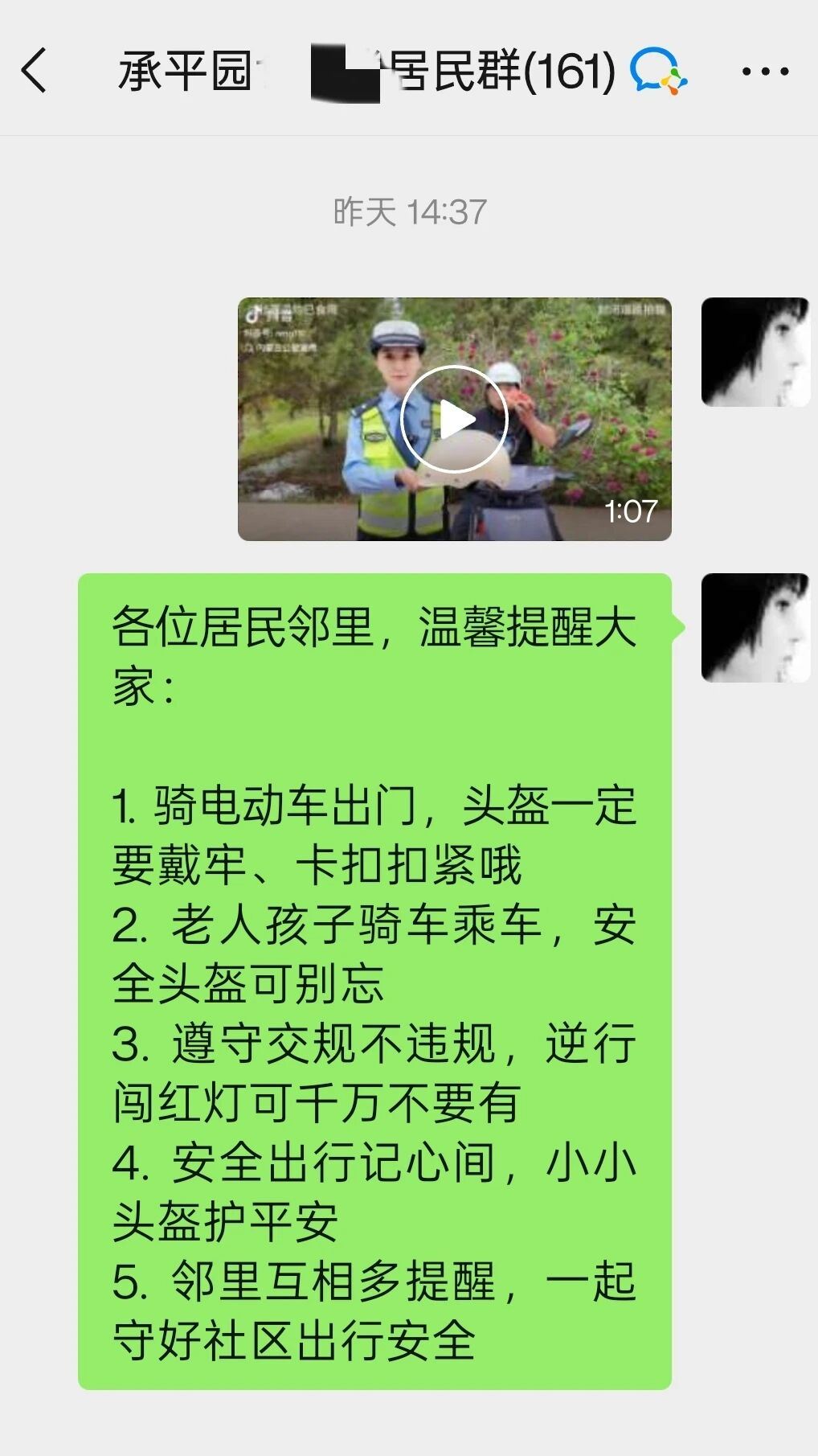 此外,社区充分依托线上平台,在居民微信群中持续推送交通安全警示视频、安全出行提示等内容,进一步扩大宣传覆盖面,营造出“人人关注交通安全、人人参与交通文明”的浓厚氛围。