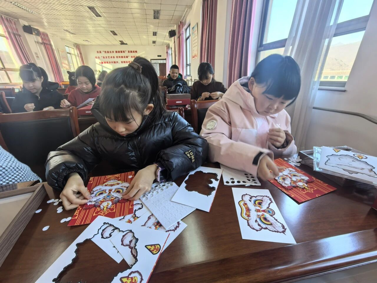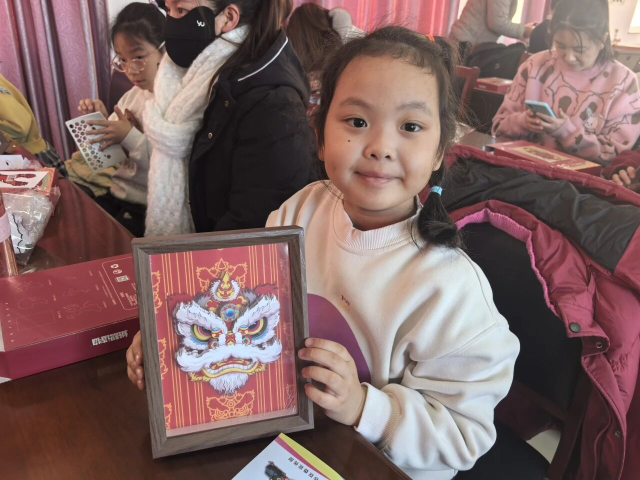 宣讲结束后,3D立体相框画制作环节正式开始。工作人员为大家介绍了貔貅、醒狮“招财纳福、守护平安”的吉祥寓意,并细致讲解了多层剪纸的分层叠贴技法。随后,在工作人员的指导下,大家小心翼翼地分层对齐、粘贴,原本平面的彩纸逐渐变成了层次分明、色彩浓烈的立体装饰画。威风凛凛的貔貅、醒狮仿佛要从画框里“跃”出来,满是新春的喜庆氛围。