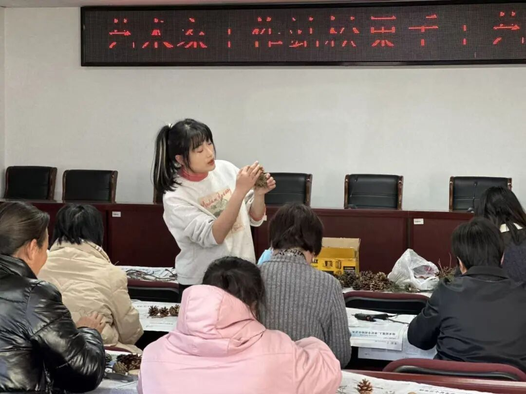 实践站聚焦艺术赋能乡村振兴,针对村里有艺术兴趣和潜力的村民,提供系统的培训和创作指导。截至目前,实践站已探索培养60余位本地乡村艺术爱好者,涵盖草编、编织、松果创作等多个领域。这些艺术爱好者不再是单纯的民间手工艺人,而是掌握了现代艺术语言、能够独立创作的乡村传统文化发扬者。他们的作品既是对传统乡村文化的传承,也是面向现代市场的创新表达。