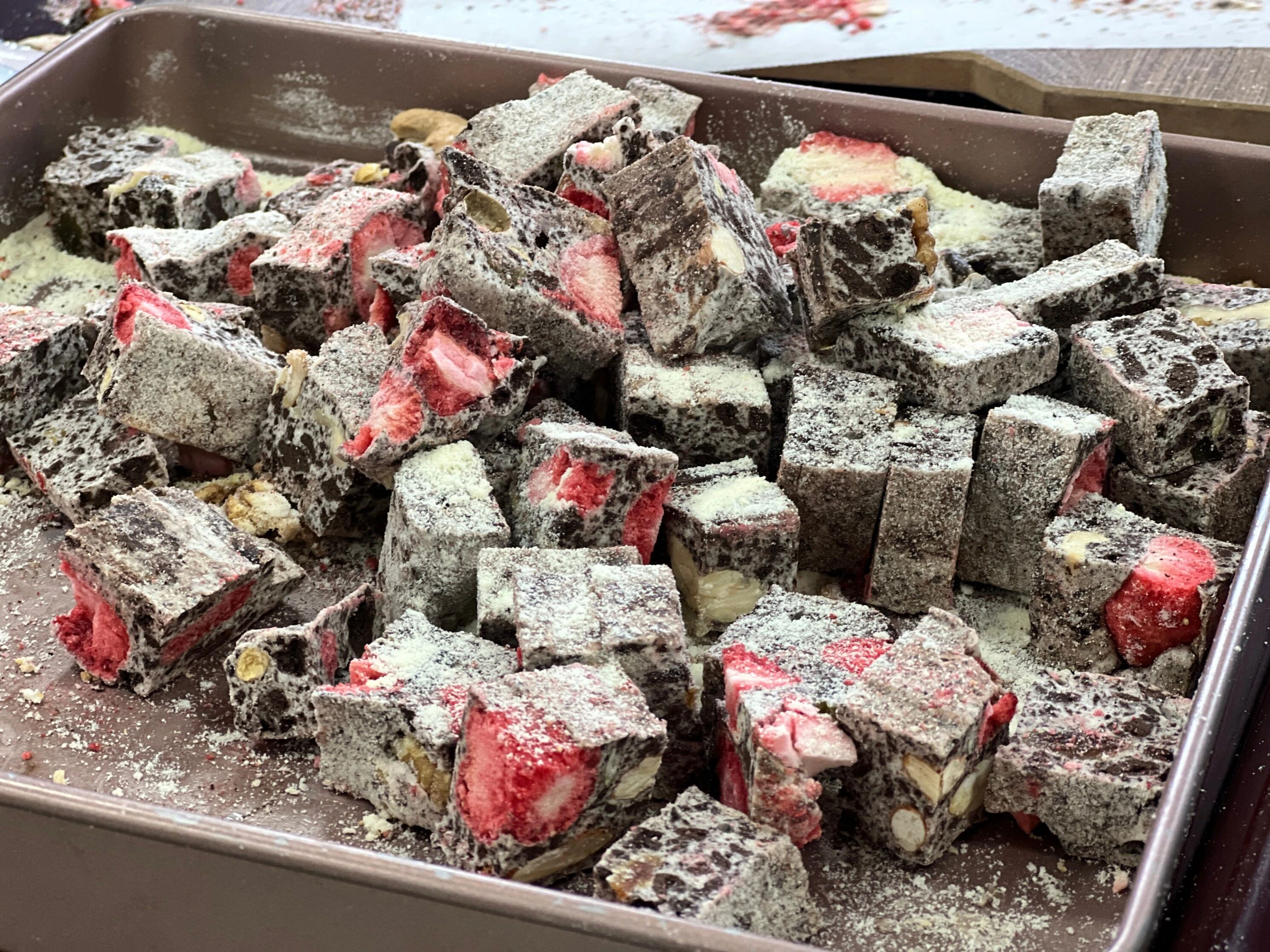 抹茶无花果款,是一场清新的相遇——翠绿的抹茶粉裹着软糯的无花果干,茶香的微涩恰好中和了果干的甜润;奥利奥草莓款,则像一份甜美的告白,奥利奥饼干碎搭配冻干草莓粒,粉白相间的色泽,瞬间俘获了孩子们的心;可可巧克力款,带来浓郁的沉醉,可可粉与黑巧克力交织出醇厚丝滑的滋味。更令人惊喜的是,同学们还发挥创意,亲手DIY了不同口味的棉花糖作为原料,为雪花酥增添了独一无二的个性色彩。