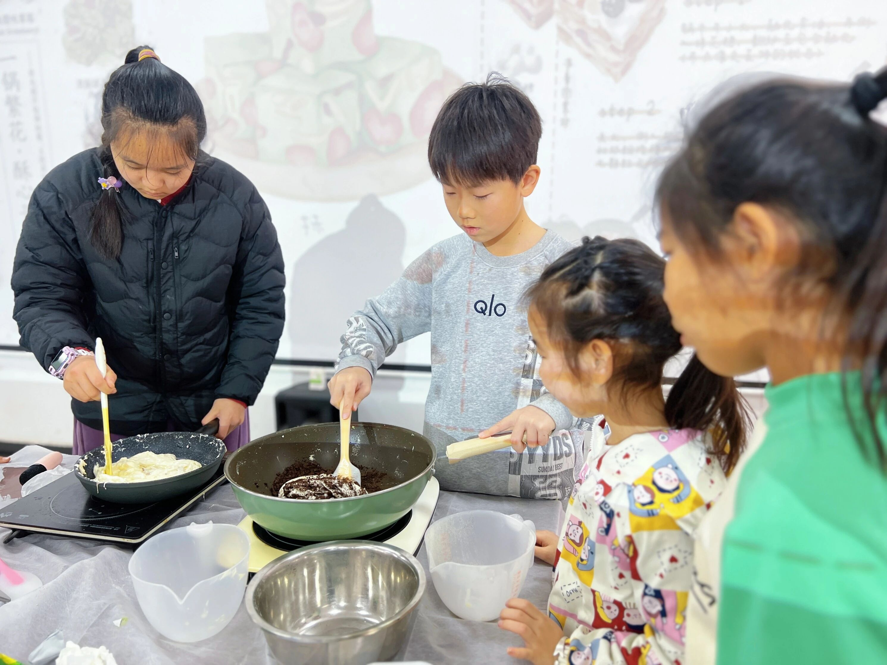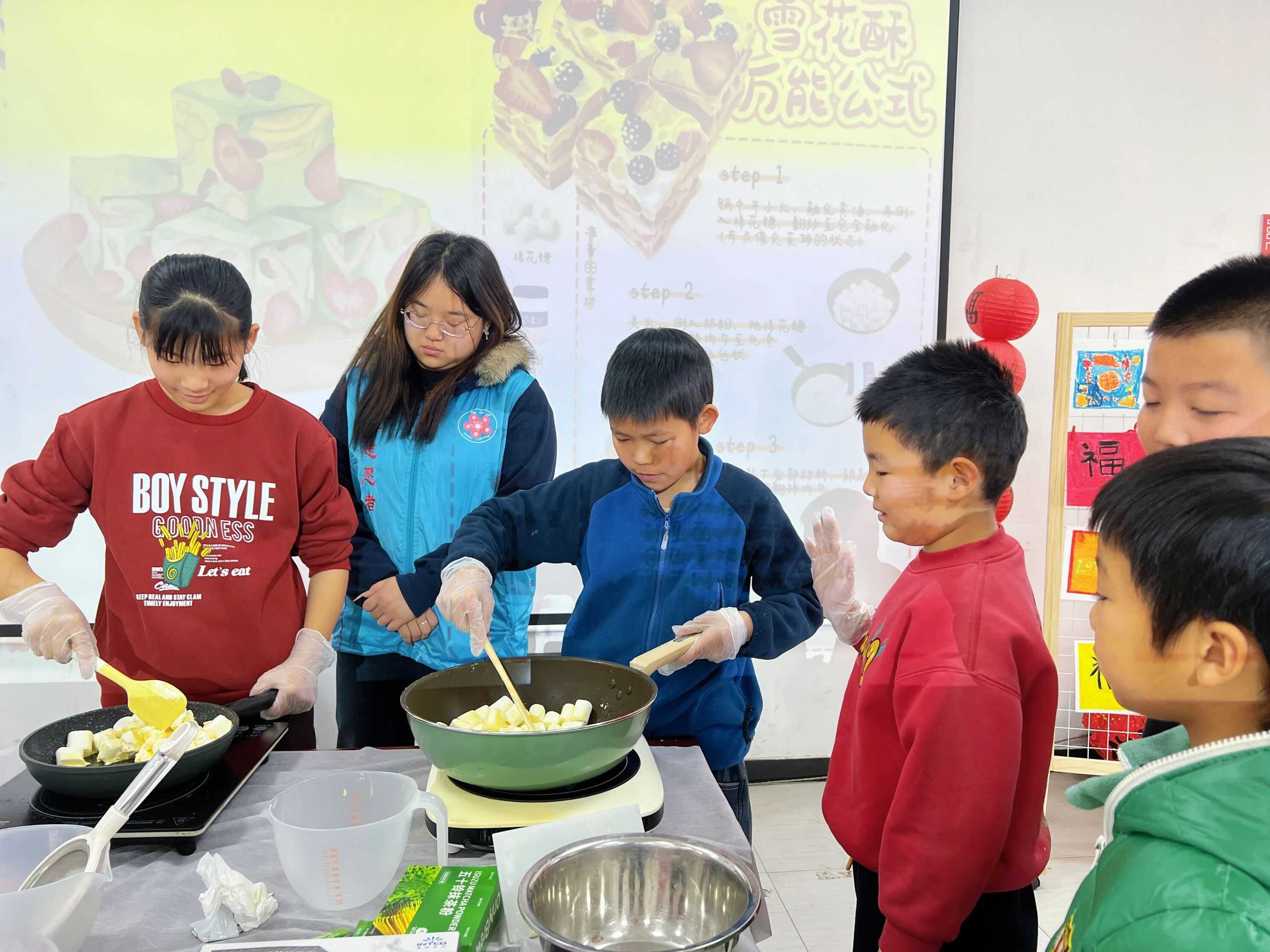 活动伊始,志愿者老师手中的不粘锅便成了全场目光的焦点。冬日的阳光透过窗棂,轻轻洒在铺着洁白桌布的操作台上,黄油融化散发的醇香与棉花糖的甜润气息交织弥漫,孩子们专注的眼神里,满是对一份甜蜜的期待。“先把黄油用小火加热至完全融化,再加入棉花糖慢慢搅拌,直到它变得柔软、能拉出丝来——千万不能心急哦。”老师温柔的叮嘱伴随着锅里细微的滋滋声,牢牢吸引着孩子们的注意力。