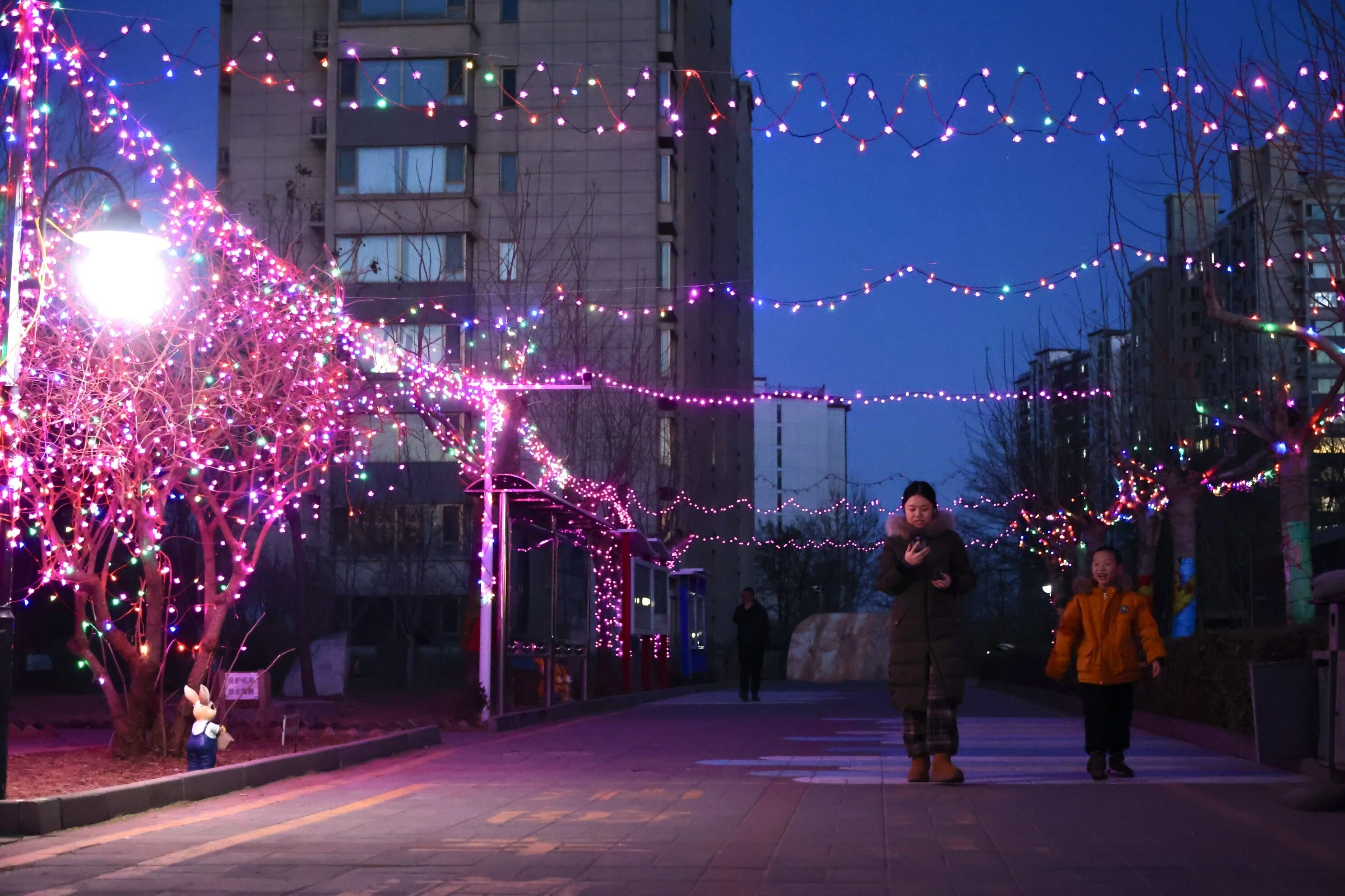 从小区门口向院内望去,五彩斑斓的彩灯错落排列、格外吸睛。夜幕降临后,彩灯次第亮起,宛如灵动的小精灵闪烁着温暖光芒,温柔迎接每一位晚归居民,似在轻声诉说“欢迎回家”。不少居民驻足观赏、拍照定格这份美好,脸上满是幸福笑意。居民王阿姨欣喜说道:“往年总觉得小区过年少了点年味,今年挂了这么多灯笼彩灯,喜庆劲儿一下子就拉满了,今年就在小区热热闹闹过年!”