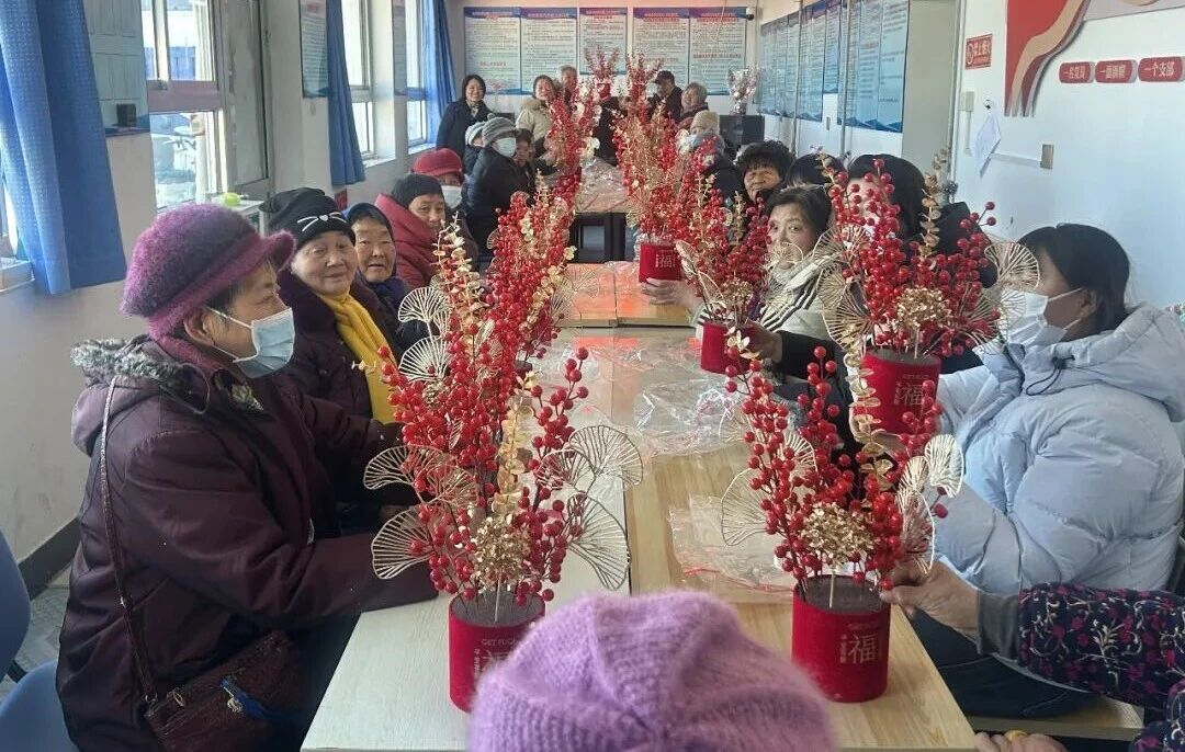 活动现场,红色抱抱桶、仿真冬青红果、金色装饰枝以及写有“福满新居”“招财进宝”等吉祥祝福的挂饰整齐摆放,处处洋溢着喜庆祥和的节日氛围。在老师的耐心讲解和分步演示下,参与者认真投入创作——固定花泥、搭配花材、点缀挂饰。大家相互鼓励、彼此协助,手中的材料逐渐变成一个个精美别致、福气洋溢的作品。有的巧妙穿插红果与金枝,营造出热闹饱满的视觉效果;有的精心调整挂饰位置,让“福”字恰到好处地点缀其间,每一件作品都承载着大家对美好生活的向往与巧思。此次活动不仅丰富了村民们的精神文化生活,锻炼了动手能力与创造力,更让大家在温馨融洽的氛围中亲身感受中华优秀传统文化的内涵与魅力。