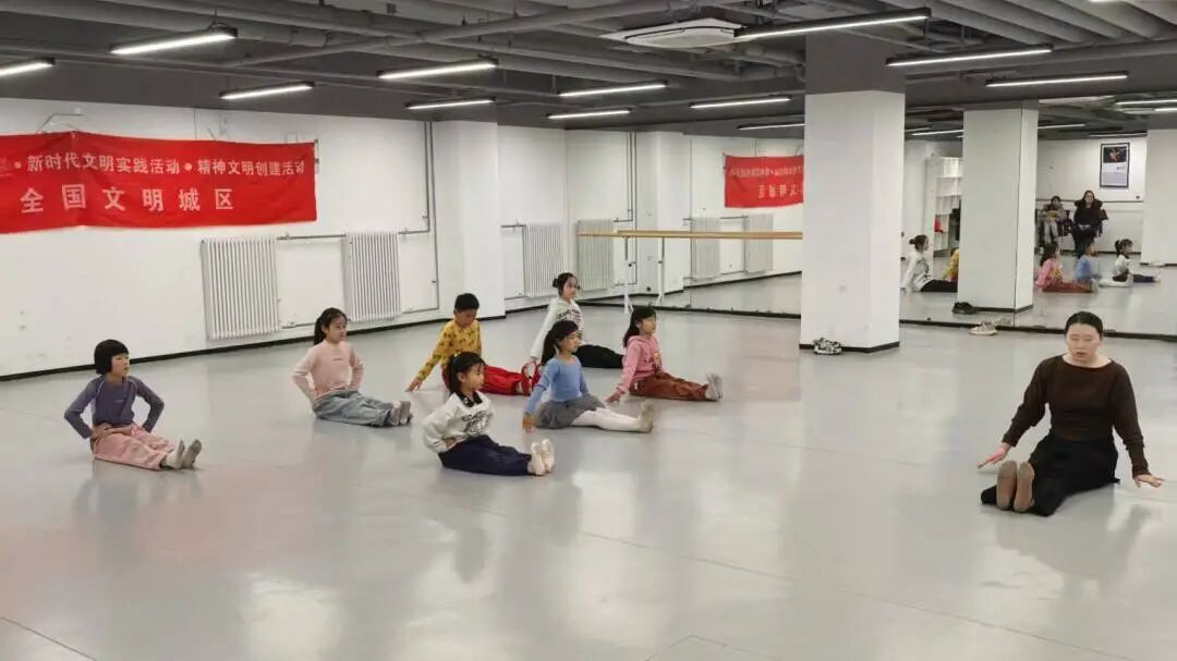课程开始,老师通过热身训练引导孩子们进入舞蹈状态。“勾绷脚”“压前屈”等基础练习帮助了小学员们活动肢体、预防运动损伤。孩子们认真模仿,逐渐放松身心,活动室里洋溢着专注而愉快的氛围。