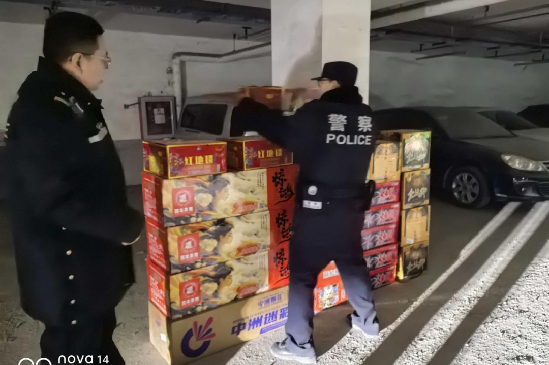 巡查过程中,工作人员在由山嘉园小区5号院地库的“僵尸车”内,发现违规存储烟花爆竹的严重安全隐患。社区工作人员高度警惕,立即按流程上报镇政府及辖区派出所。接到上报后,相关部门快速响应、联动处置,派出所民警第一时间抵达现场,经专业核实与清点,当场查处各类烟花爆竹6类、共计24箱205公斤,及时消除一处重大安全风险。