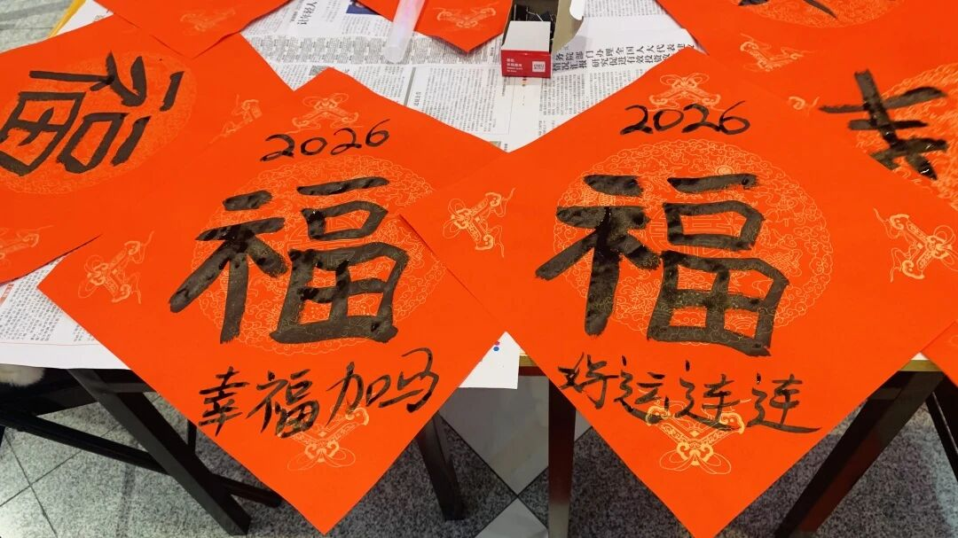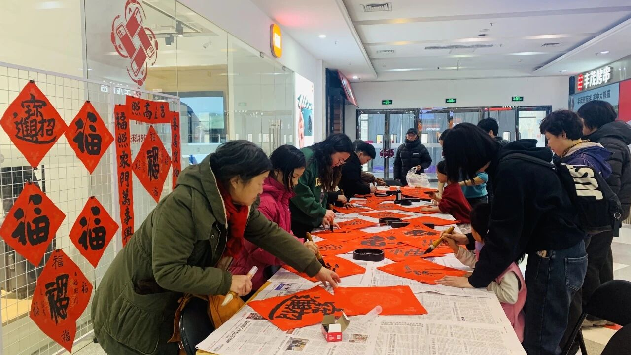 活动现场,鲜红的春联纸铺展如霞,笔墨纸砚整齐陈列。书法爱好者们挥毫泼墨,笔走龙蛇间,马上有钱,龙马精神等寓意吉祥的春联与圆润饱满的“福”字跃然纸上。现场墨香氤氲、笑语盈盈,浓厚的年味儿在红纸黑字间悄然升腾。