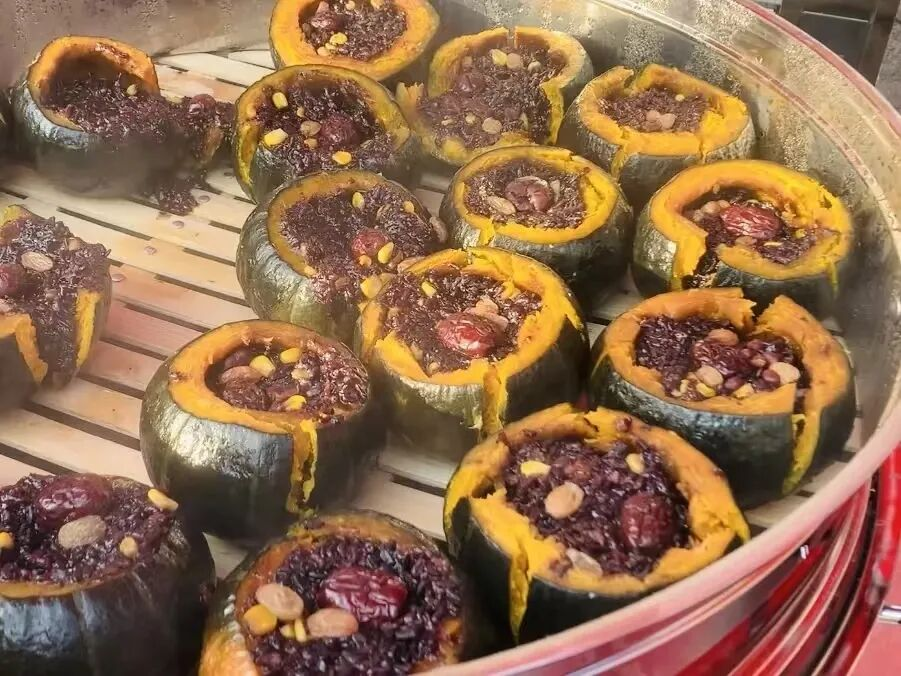 市集里,香气四溢:炸串、糖葫芦、特色糕点、三河豆片等地道小吃唤醒记忆中的年味;春联福字、手工艺品、本土特产琳琅满目一;更有“平谷八大碗”一笼蒸出幸福年,一站式备齐年货,把福气带回家。