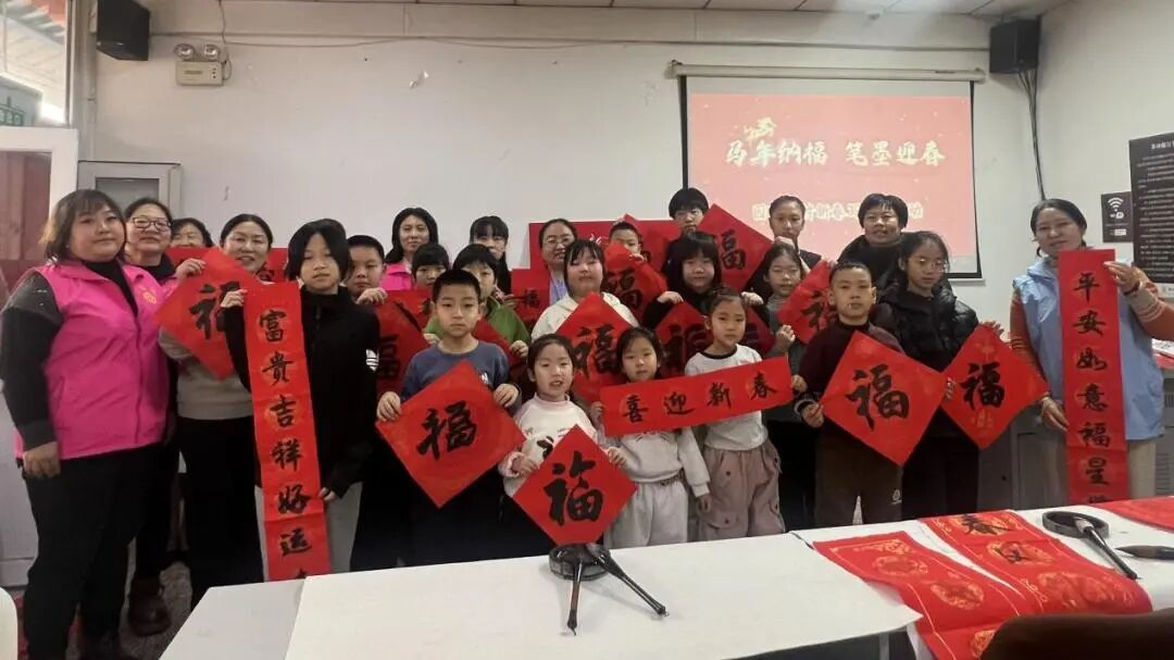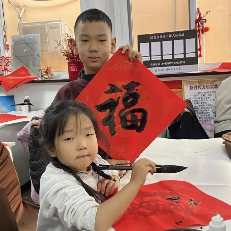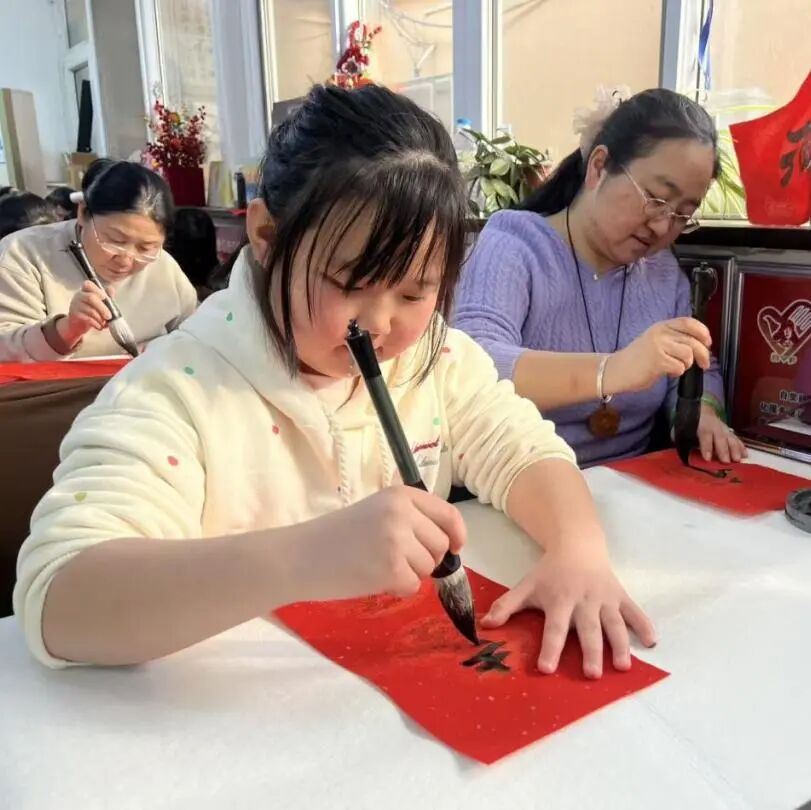 孩子们在家长和志愿者的引导下,也兴致勃勃地拿起毛笔,认真模仿、大胆书写。他们笔下或许略显稚嫩,但每一横每一竖都充满了专注与喜悦,写出的“福”字童趣盎然,别具一格。活动现场欢声笑语不断,大家互相品评、交流技巧,更相互送上提前的新春祝福。红色的春联和“福”字铺满桌案、地面,汇成了一片喜庆的红色海洋。